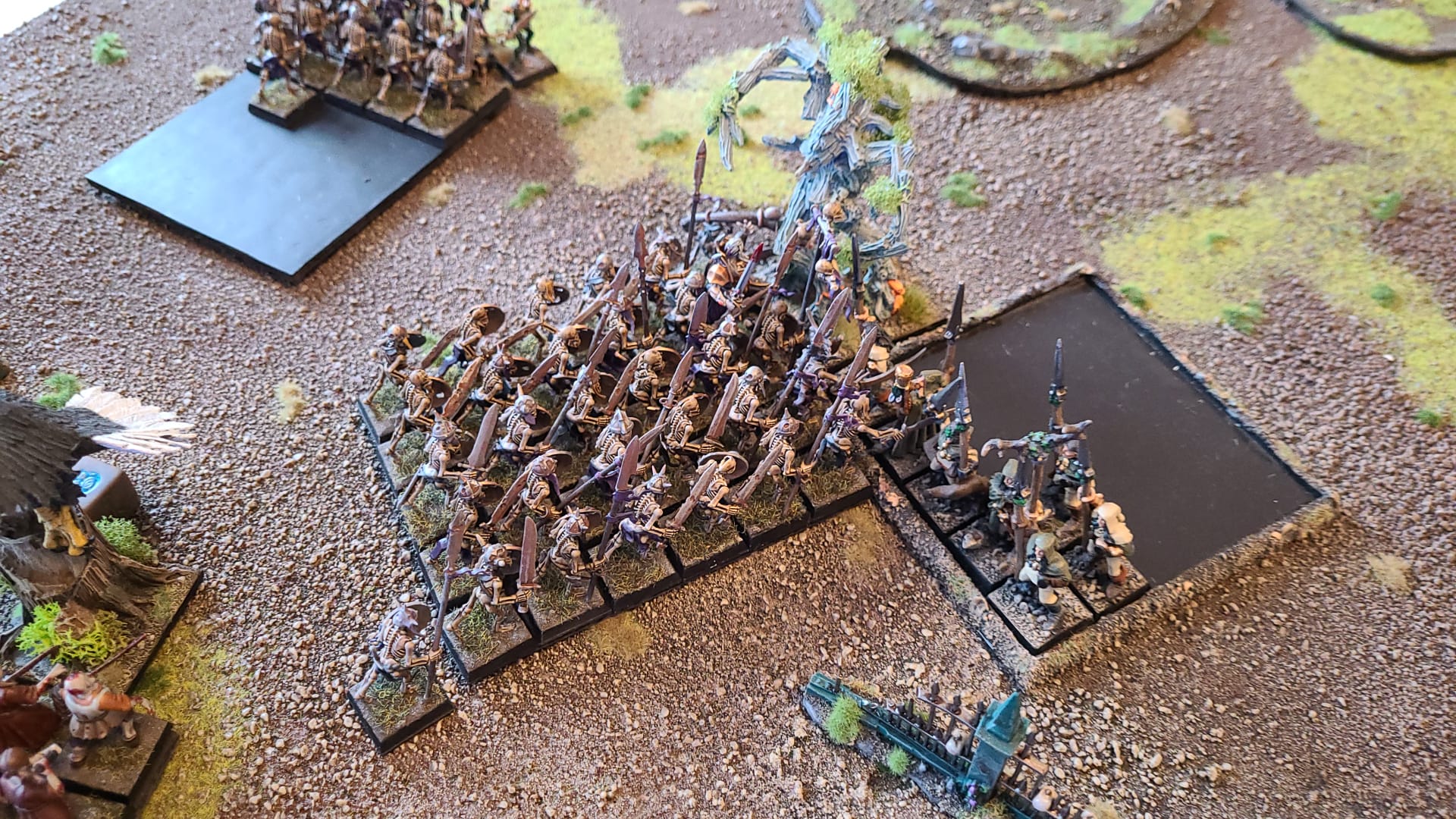 Dieser schieren Maße an untoten Kriegern und dem Feuer waren die Baumschrate nicht gewachsen. Unter Bedrängung traten sie den ungeordneten Rückzug an. Die 2. Schädelkohorte verfolgte sie. Die behäbigen Bäume waren zu langsam, um ihren knochigen Verfolgern zu entkommen. Dabei stürmten die Skelettkrieger in die Kampftänzer und verwickelten diese in den Kampf. (hierbei erwürfelte ich wieder die Doppel 6. und dann flog dann der Würfelbecher durch den Raum) Sein eigenes Regiment liest Johann in Richtung des anstürmenden Baummenschen ausrichten. Dieser prallte nur wenige Momente später in die Reihen der Skelette. Ihm folgte der Rest der Ewigen Garde. Ein zermürbender Schlagabtausch begann. Keine Seite konnte den Kampf so wirklich für sich entscheiden. Johann wirkte erneut Nagash Todesblick. Diesmal auf den alleine umherirrenden Lathai. Dieser wurde, wie schon zuvor Aerendyl von den Blitzen getötet. Die Ewige Garde wurde weiter dezimiert. Auf der Rinde des Baummenschen zeichneten sich tiefe, verkohlte Kerben ab. Skelettkrieger fielen, doch kurz darauf wurden ihre Reihen mit den Leichnamen der gefallenen Elfen gefüllt.