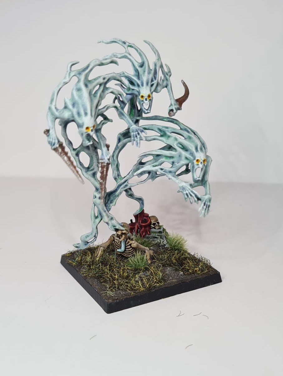 Johann spürte, dass sich eine dunkle Macht in der Nähe sammelte. Von Tag zu Tag wurde sie stärker und gewann schlussendlich seine Aufmerksamkeit. Er marschierte mit Stanislas und einer kleinen Eskorte aus Skelettkriegern zum Waberbruch-Friedhof. Am Friedhof angekommen, ließ Johann seinen Blick wandern. Über dem Friedhof hingen dicke Nebelschwaden. Er konnte zwar nicht sehr weit sehen, doch man konnte erahnen, wie groß dieser Friedhof sein muss. "Ein recht großer Friedhof für diese Gegend", dachte Johann. In der Ferne konnte Johann ein größeres Gebäude erkennen. "Oder war es doch eher ein Turm?". Es blieb ihm keine Zeit sich weitere Gedanken darüberzumachen. Die dunkle Macht pulsierte in ihm. Stanislas begann Worte zu murmeln. Johann stieg ein.... Ein markerschütternder Schrei erklang. Johann und Stanislas mussten sich die Ohren zuhalten. Selbst für untote Geschöpfe war dieser Schrei nicht zu ertragen. Einige Skelettkrieger fielen zusammen. Kleine Knochenhaufen lagen nun dort, wo vorher die Skelette standen. Johanns Blick suchte den Nebel ab. Dann sah was die kaum zuertragenden Geräusche machte, eine Türkies, grünliche geisterhafte Frauengestalt schwebte auf ihn zu. Eine Banshee. Sie hatte die Gestalt einer alten Schankfrau. Johann begann Worte zu murmeln. Doch der Versuch, die Banshee unter seine Kontrolle zu bringen, misslang. Die Banshee schwebte nun einige Meter vor ihm und lachte. "Du wirst mich nicht kontrollieren können", sprach sie. "Ich bin Maria", und sie begann ihre Geschichte zu erzählen "Ich war einst die Hofzauberin von Rosenheim. Doch einst bezichtigten mich Edelleute die dunklen Mächte zu beschwören, um den Grafen zu kontrollieren damit ich selbst herrschen könne. Der Graf von Rosenheim glaubte ihnen und wollte meinen Kopf. Ich musste fliehen und bin in Feldmark untergetaucht. Ich nahm hier eine neue Identität an und arbeitete als Wirtin in der Waldschenke. Dann kam das Chaos. Ich wurde von den Anhängern des Chaos gefangen genommen und in eine Gruft auf dem Friedhof verschleppt. Dort probierten sie irgendwelche Tränke an mir aus. Sie murmelten immer wieder komische Dinge und der Name Nurgle fiel häufig. Mein körper quoll auf. Meine Atemwege verängten sich, bis ich erstickte. Seitdem kann ich diesen Friedhof nicht verlassen. Ich werde mich deiner beugen und dir dienen, wenn du mich Befreist damit ich mich an den Edlen von Rosenheim und auch an den Anhängern des Chaos rächen kann." Johann nahm ihr Angebot an. So einen mächtigen Diener in seinen Reihen zu wissen erfreute ihn. Durch ein magisches Ritual band er Marias Seele an die seine. Nun war es ihr erlaubt den Waberbruch-Friedhof zu verlassen.