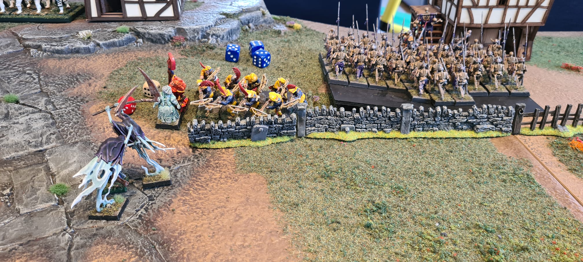 Auf der linken Flanke schwor Karl Gremper seine Hellebardiere auf den Ansturm der Skelettkrieger ein. Diese bezogen Stellung hinter der kleinen Mauer. Hermann Kramer, der Hexenjäger, richtete seinen Pistolen auf den Vampir inmitten der Skelette und drückte ab. Er war ein hervorragender Schütze. Eine der beiden Kugeln hätte den Vampir mitten ins Gesicht getroffen, doch eine magische Barriere schützte ihn. Die untote Welle trafen auf die Hellebardiere, wie ein Hammer auf den Amboss. Anfangs konnten die Hellebardiere dem Druck standhalten und die Skelettkrieger daran hindern, die Mauer zu überqueren. Als Erstes gelang es Johann von Schulte, die Mauer zu überqueren. Auf der anderen Seite wirbelte er durch die Nordländer. Dies verschaffte seinen Kriegern Zeit, die Mauer zu erklimmen, auch an anderen Stellen brach die Verteidigung zusammen und immer mehr Skelette kamen über die Mauer. Die schiere Masse brach am Ende den Mut der Verteidiger und ließ ihre Reihen sich in einem heillosen Chaos zurückziehen. Da sie deutlich schneller als die Toten waren, entkamen der Großteil aus der Schlacht. Karl, der sich von der Panik hatte, anstecken lassen, floh ebenfalls. Johann richtete nun sein Augenmerk in Richtung Kapelle. Die letzten Flagellanten hatten sich ihrem Schicksal ergeben. Schlussendlich wurden auch ihre Seelen ihren Körpern entrissen. Zurück blieben kalte, bleiche Hüllen, mit aufgerissenen Augen.
