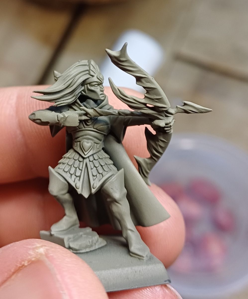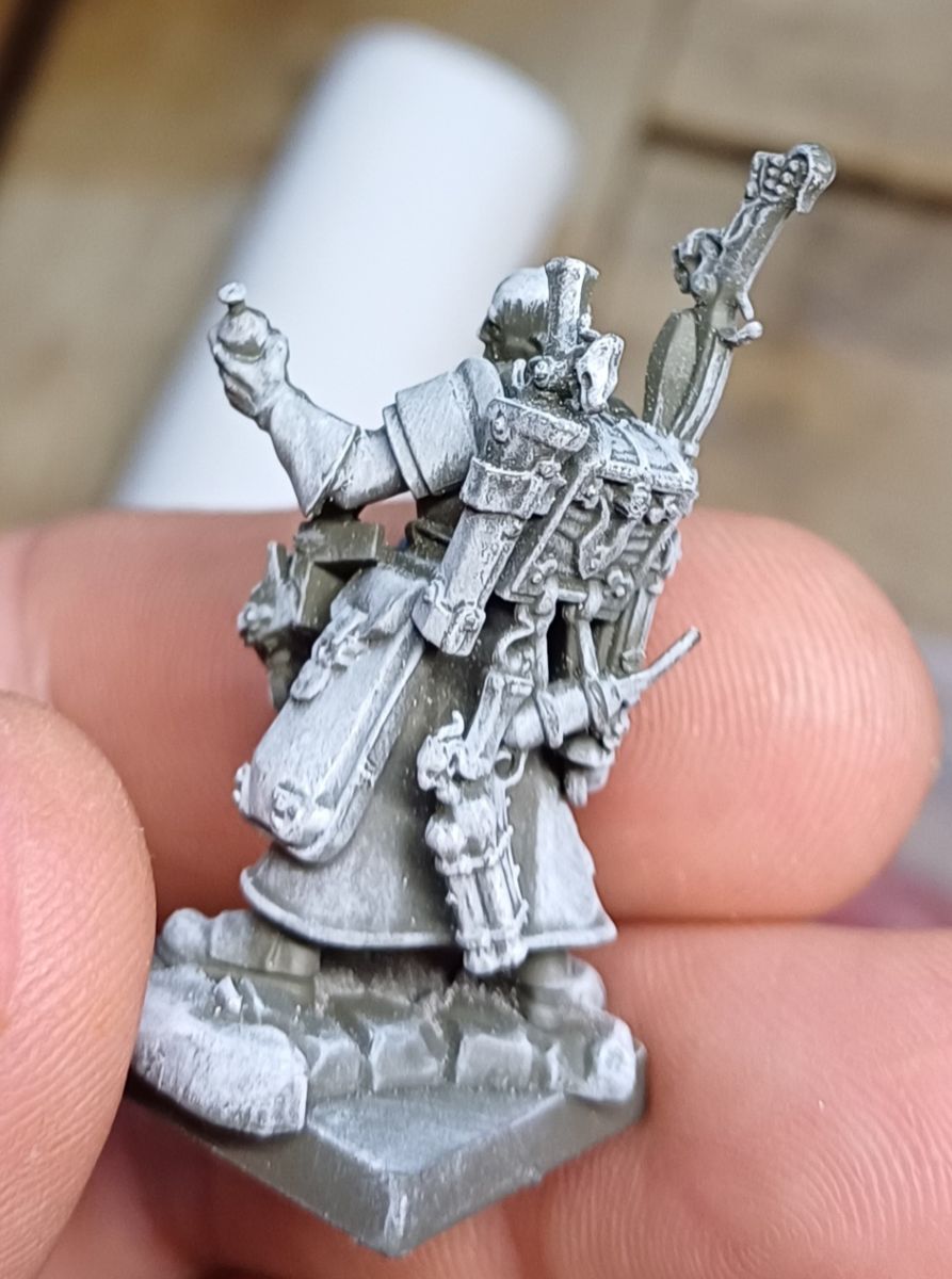 Ich bin vom harten Kontrast der Schwarzen Grundierung und des mit ggf verschiedenen Weißstufen Trockenbürstens weg zu einem dunkleren Grau als Grundierung. bevor das Trockenbürsten kommt.