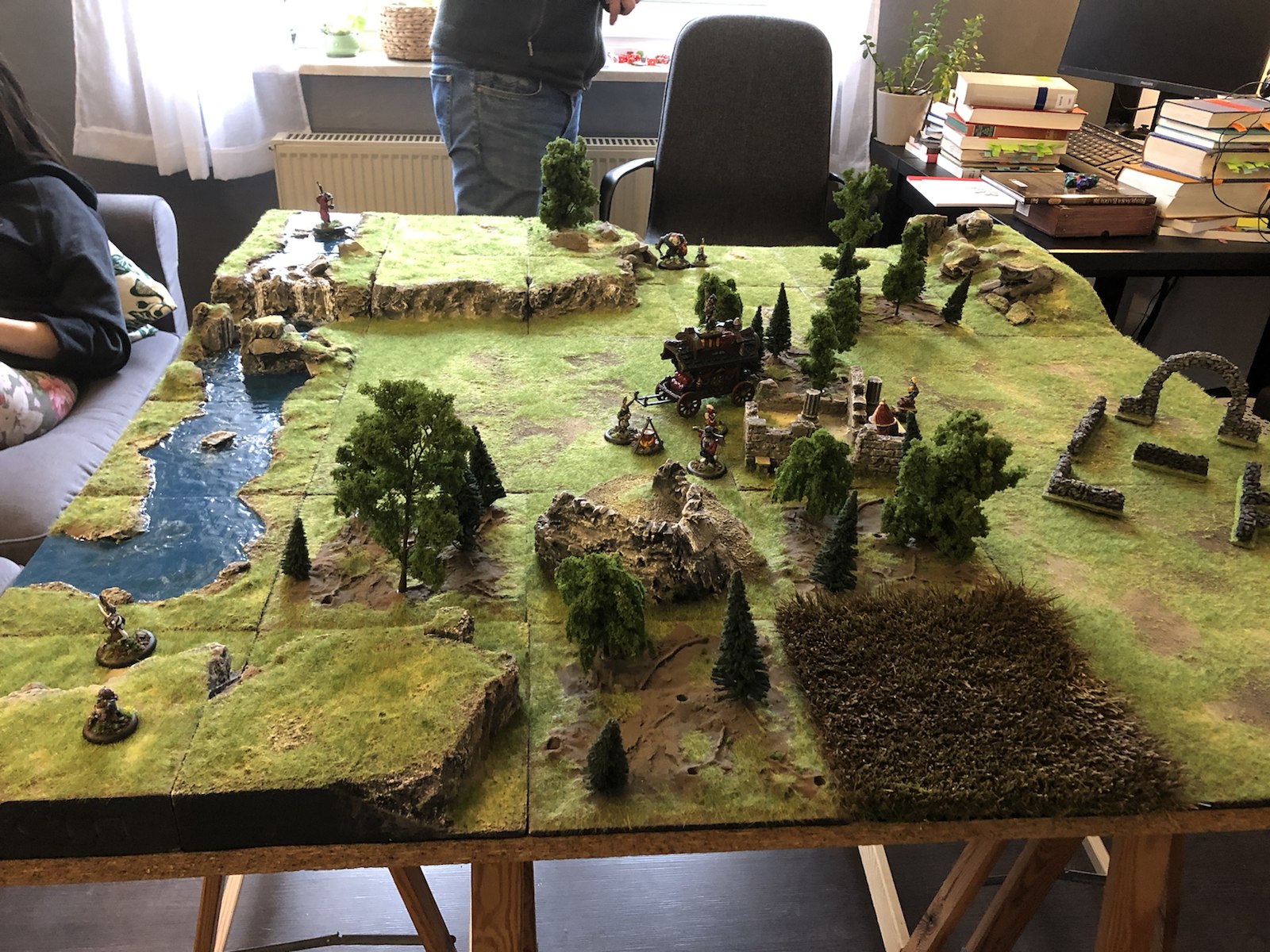 Wegen der Spielplatte: Ich würde mich ja gerne damit rühmen, aber die Lorbeeren verdient Tabletop Modellbau. Deren modulare Platten sind der Hammer.