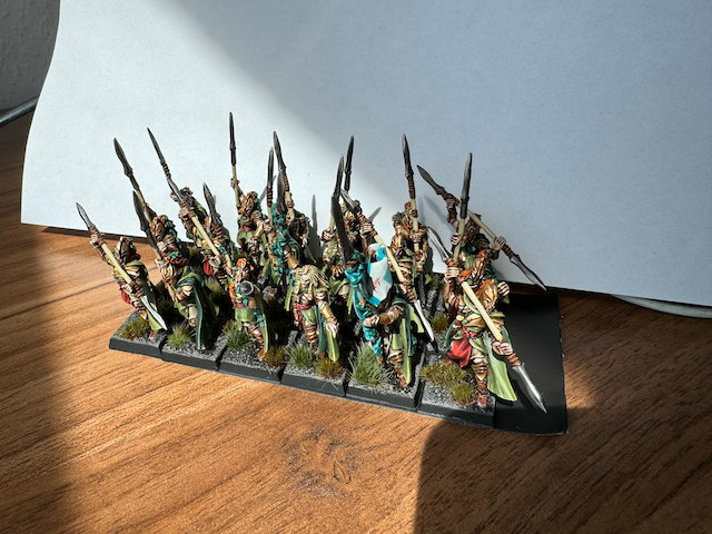 Den Abschluss der aktuellen fertigen Projekte machen meine Dunkelelfen. Die Echsenreiter hatte ich jetzt seit ~12 Jahren in verschiedenen Boxen gelagert, sie zwischendurch immer mal angefangen zu bemalen und wieder abgebrochen und war nie zufrieden. Nun nicht mehr.