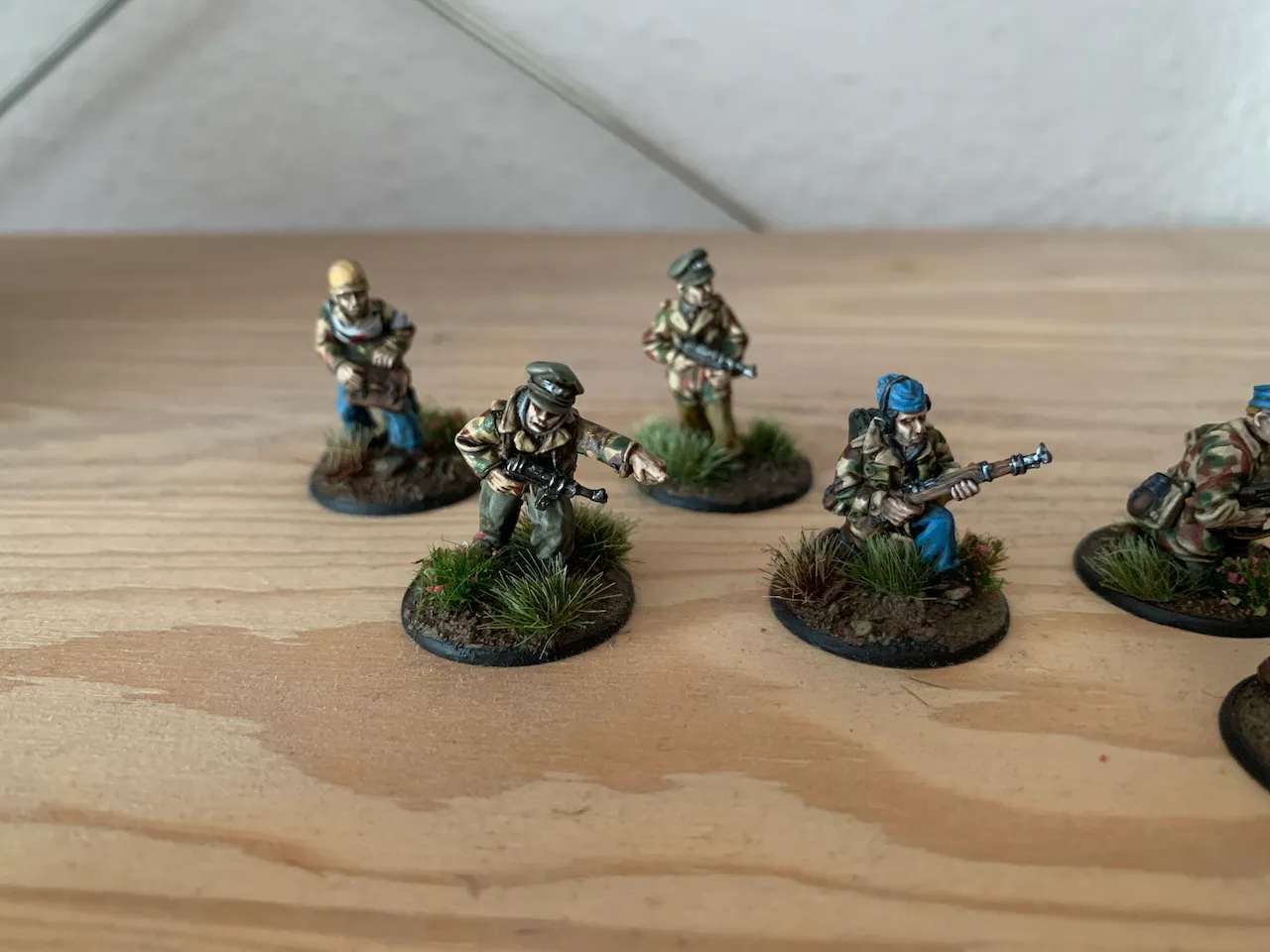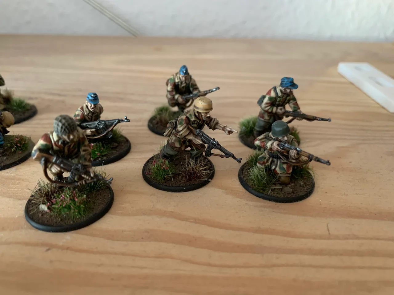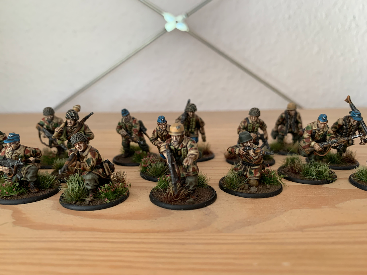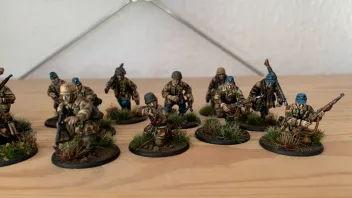 Mal wieder was fertig geworden. Ein Trupp Fallschirmjäger und Offiziere. Hab etwas am Tarnmuster gearbeitet und werde mir jetzt mal Waffenteams bestellen und Feldbefestigungen basteln. Mit den restlichen Infanteristen dürfte das Projekt dann auch bald abgeschlossen sein und ich gehe weiter zum Bauen einer Transportbox aus Holz. Danach vlt Marines oder endlich Australier für den Dschungel. Wobei die Teuer geworden sind und ich vlt einfach zu US Marines wechseln könnte...