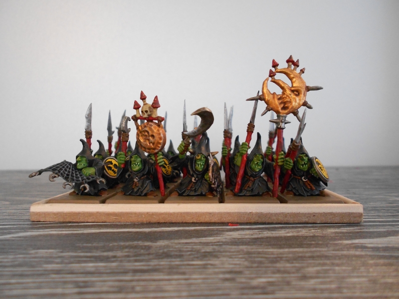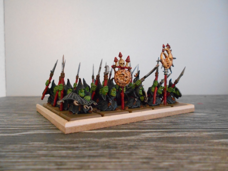 würde euch hier gerne mein erstes fertiges Regiment vorstellen, die Nachtgoblins vom Stamm des "Bös'n Mondez".