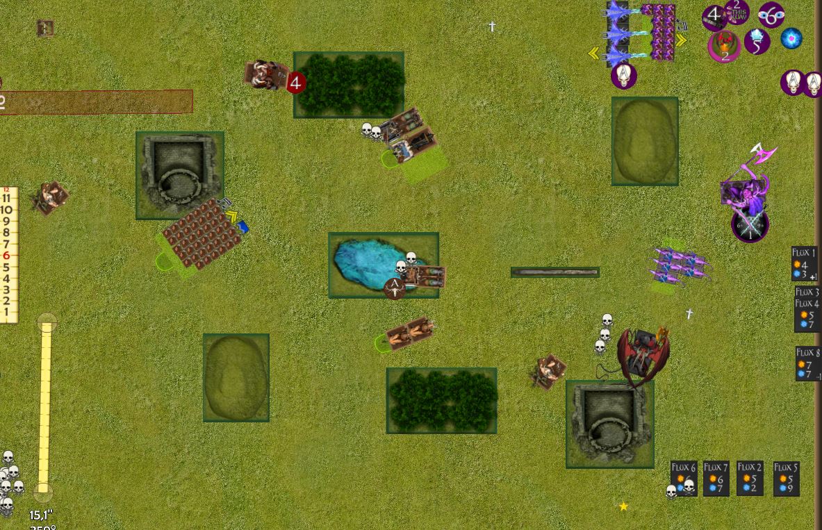 Das ist also die Situation auf dem Bild oben und da haben wir für eine Woche unterbrochen. Ich habe überlegt, was er wohl tun würde, und dachte, dass er (auch weil Break the Spirit auf dem Scourge liegt und er daher kaum zu meinen Scorern marschieren will) vermutlich mit den beiden großen Dämonen die Streitwagen in die Klammer nehmen würde. Aber er entscheidet sich ganz anders. Er greift mit seinen Lemuren den Gortach an und zieht die Kurtisane rüber, um den Gortach danach zu töten. Seine anderen Einheiten ziehen sich in die obere rechte Ecke zurück und der Scourge bedroht meine Einheiten, damit sie nicht weiter nachrücken.