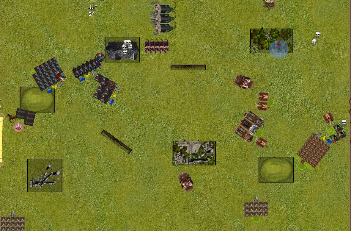 In seinem Zug gehen die Wretched Ones natürlich mit einer 14 in den Riesen und zerlegen den. Dann überrennen sie hinter meine Linien. Ein sehr schlechter Start. Der Rest seiner Armee beginnt den langen Weg um die Flanke und die Feldraks bedrohen seinen Rücken, damit da keine Ambusher kommen. Das hätte ich mangels Kampfkraft aber eh nicht gewollt. Seine Magie ist aus der Entfernung trotz Veil Walker ungefährlich.