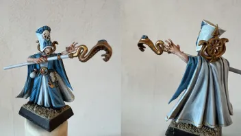 Und da wir gerade ein Turnier haben, ich das Imperium mit einem Lichtmagier spiele und mir das Modell noch fehlte, habe ich die Zeit nach dem Vampir genutzt und diesen Kitbash aus Luminark-Lichtmagier und Collegiate-Lichtmagier gebastelt. Das beste beider Welten