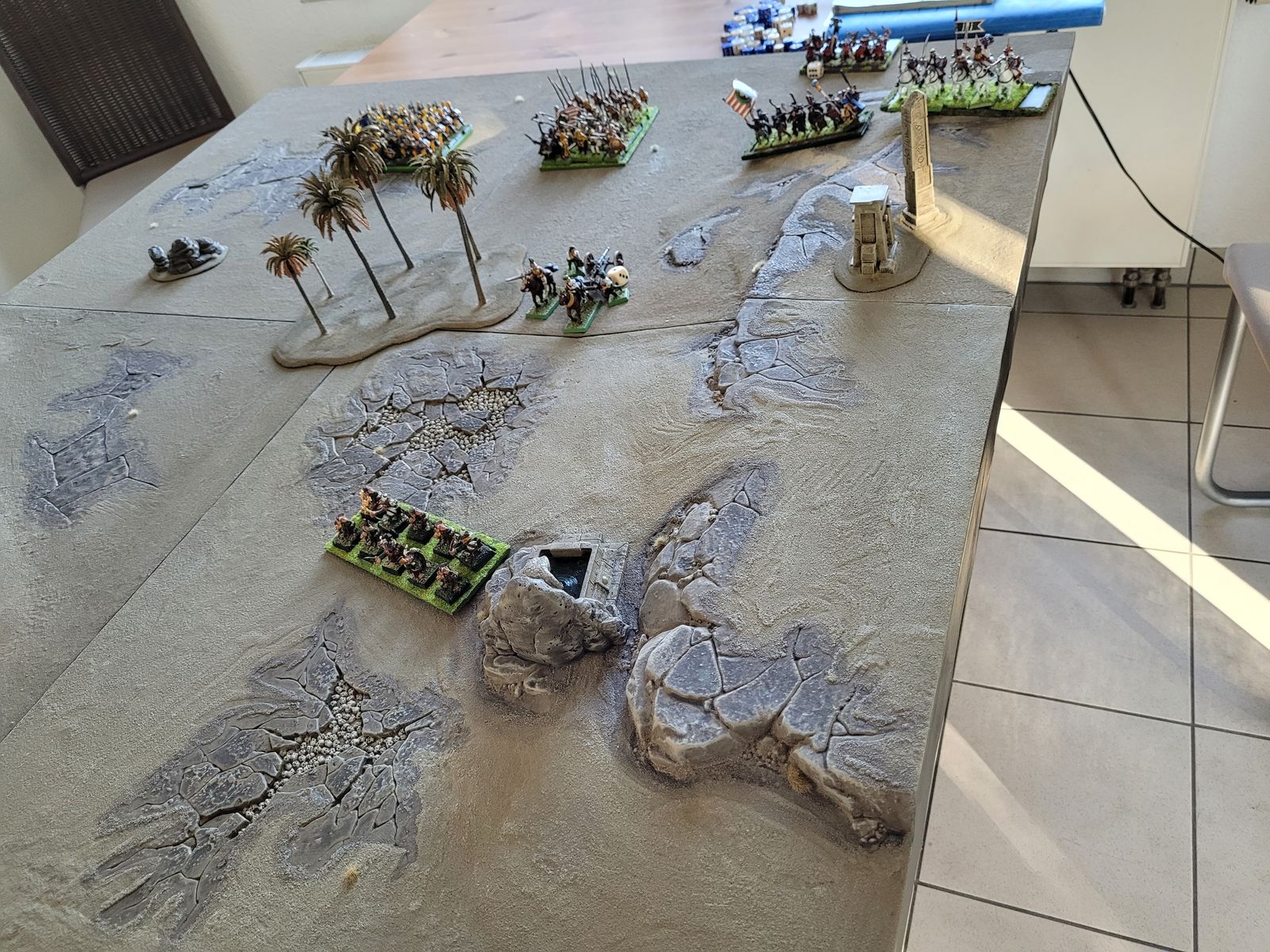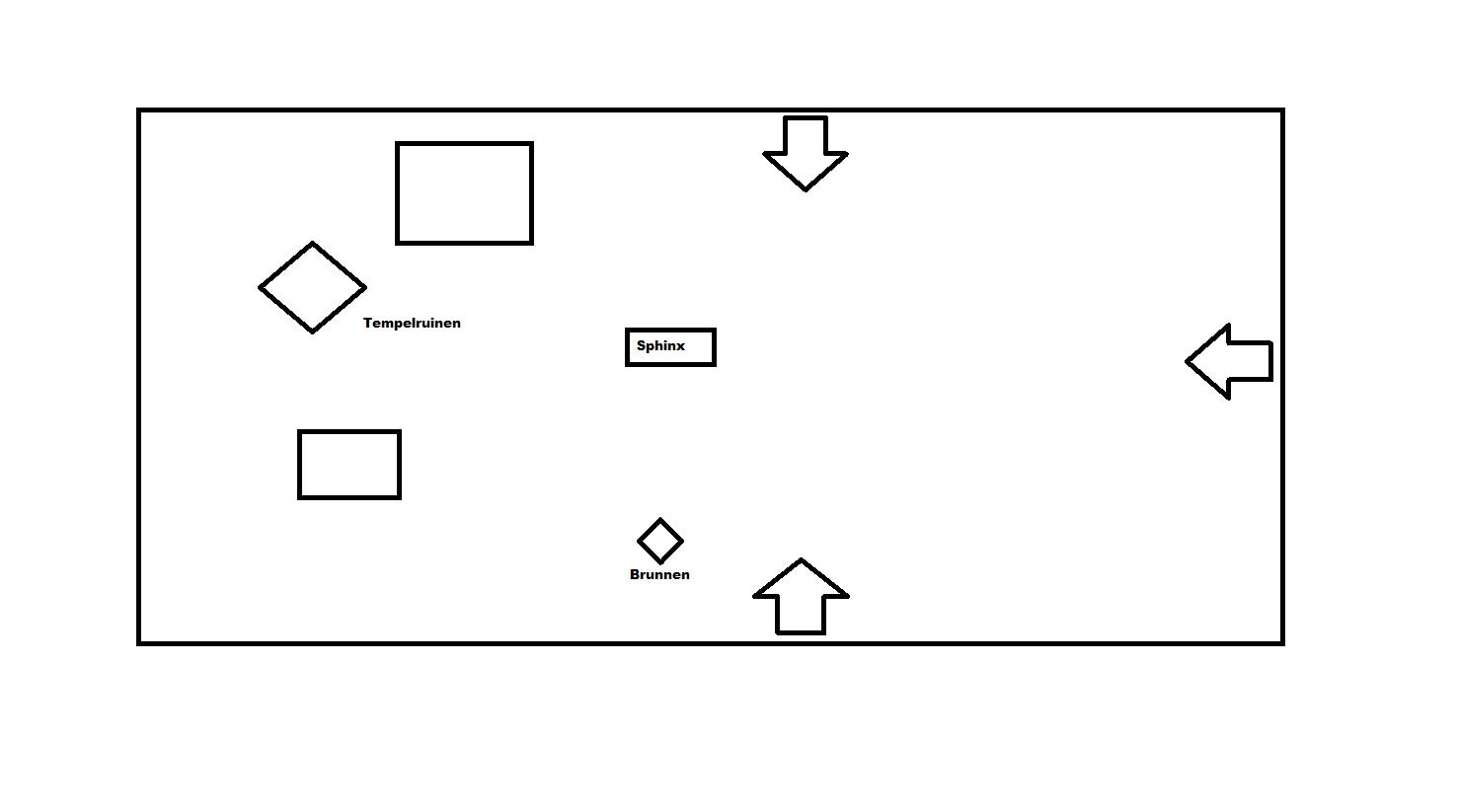 Aufstellung Söldner Die Söldner beginnen das Spiel von Spielfeldrand auf der den Tempeln entfernten Seite. Lumpins Kampfhähne als Kundschafter sichern den Brunnen. Bronzinos Kavalleriekanone nutzt die Vorhutbewegung um möglichst schnell zum Brunnen zu kommen