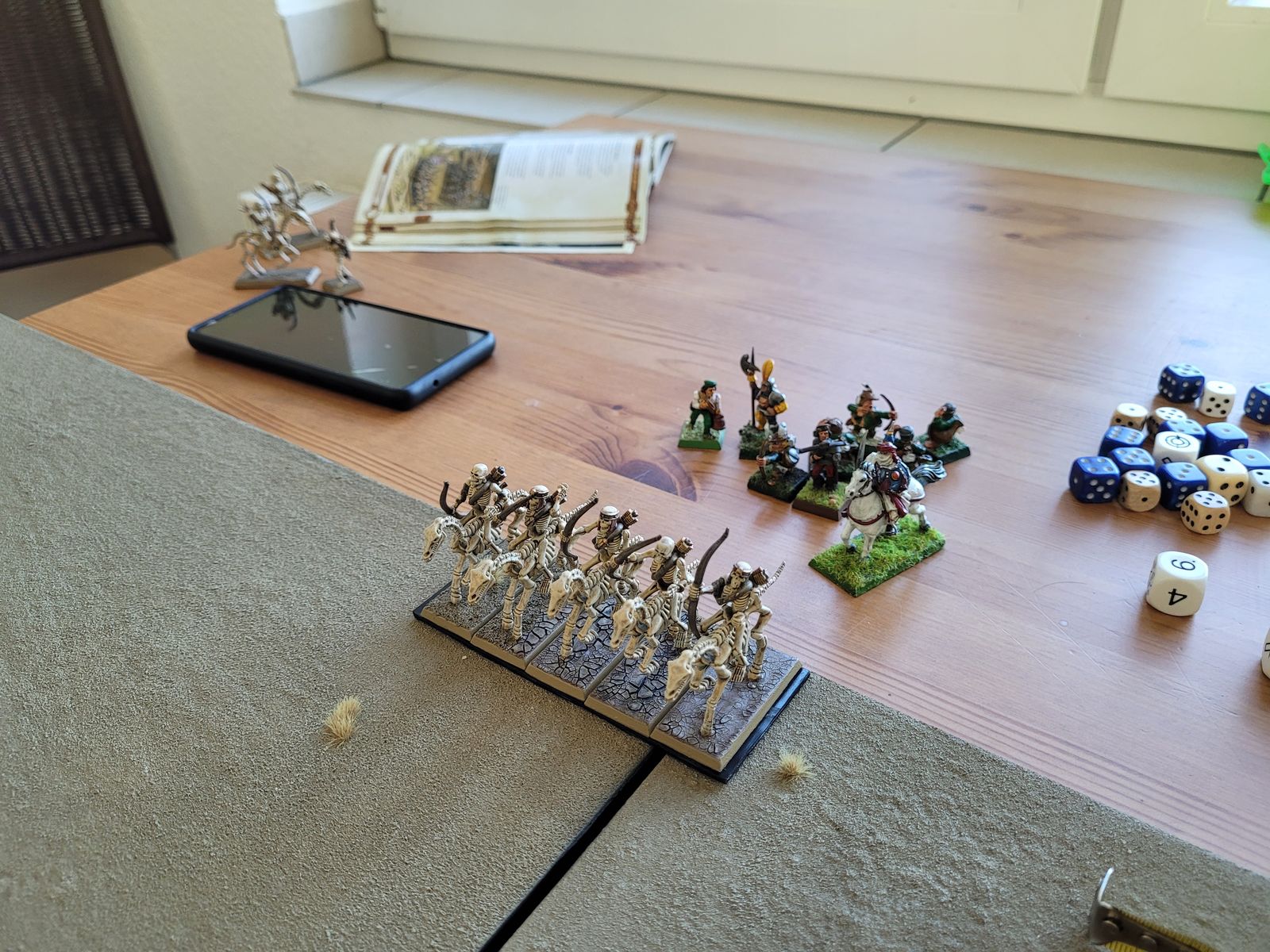 Die Gruftkönige bringen je eine Einheit Bogenschützenreiter und Skelettbogenschützen auf die Platte. Die Bogenreiter nehmen die Lumpins Halblinge ins Visier und von Pfeilen gespickt sinkt ein Halbling zu Boden.