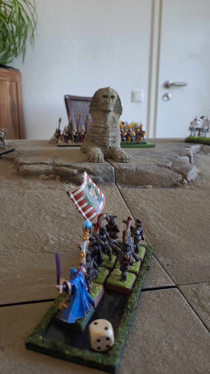 Das Katapult trifft die Leibgarde mit einem Volltreffer, der aber nur drei Tote nach sich zieht. Die Bogenschützen erschießen einen der Gardisten. Ein Priester des Todes zaubert Shems gleißender Strahl auf die Garde- Ergebnis: Sechs Treffer, drei Verwundungen alle gerüstet. Die Wüstenreiter greifen in die Flanke der Wüstenhunde an. In ihren leeren Augenhöhlen dämmert ein Hauch erkenntnis, dass es ein Fehler war, als Al-Muktar einen von Ihnen mit dem Säbel zerlegt und das Pferd mit den Hufen einen zu Staub zertritt.