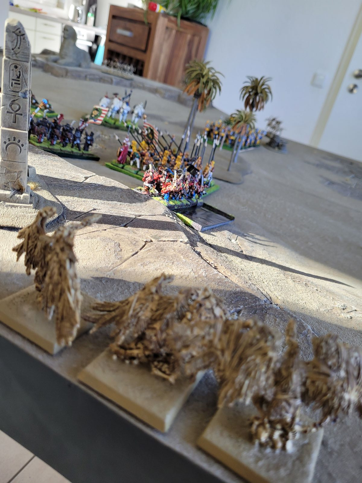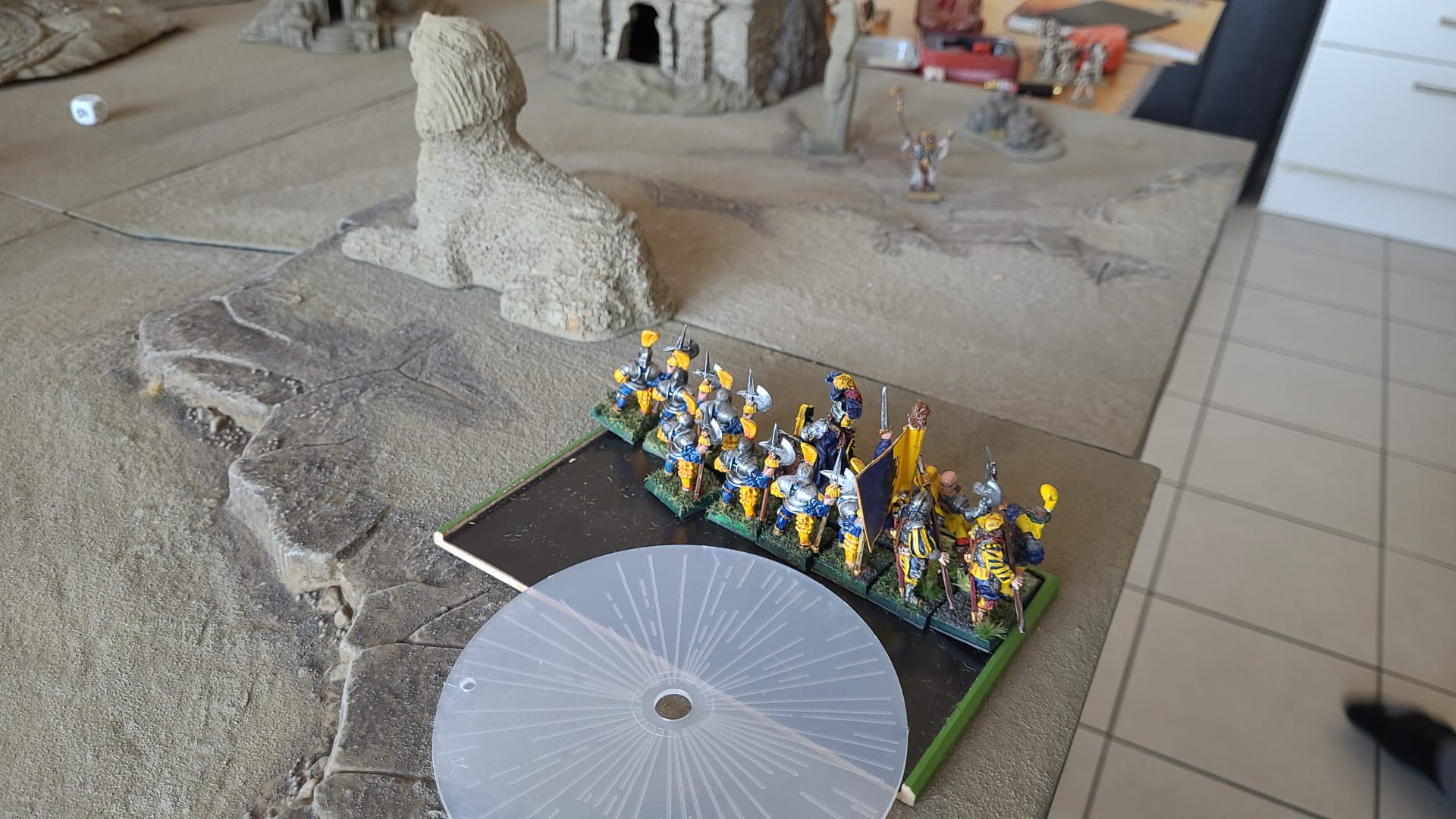 Das Ziel der Söldner bleibt der Brunnen bzw. die in der flimmernden Hitze schimmernden Tempelanlagen in der Hoffnung den Durst zu löschen bzw. Schatten zu finden. Es gibt nur den Weg nach vorne, auch wenn wie aus dem Nichts die ersten verfluchten Skelette aufgetaucht sind und verfluchte Palmenhaine und seltsam wabernde Sandflächen den direkten Weg behindern. Der Durst trifft Leopolds Leoparden, welche ihn aber (noch) stoisch ignorieren. Mit verdorrten Kehlen schleppen sich die Leoparden vorwärts. Bei den Scharfschützen von Miragliano bricht ein Scharfschütze ob des Durstes zusammen und steht nicht mehr auf. Al Muktars Wüstensöhne schwenken in Richtung der rechten Flanke, um die Garde des Zahlmeisters zu unterstützen, geraten dabei in Khemrischen Treibsand, der einen der ihrigen trotz seiner Erfahrung verschluckt. Hermann Kiesewetter schiebt seine Tagträume von Brathähnchen Mootlandart mit jungem, tileanischen Weißwein beiseite und zaubert Brionas Zeitkrümmung erfolgreich, aber eine Macht aus dem Wüstensand ließ die Winde der Magie verfliegen, bevor sie ihre volle Wirkung entfalten konnten. Lumpins Kampfhähne betrachten ihren Kameraden und die durch den Wüstensand runierten Pasteten in seinem Gepäck und legen entsprechend verärgert auf die Wüstenreiter an. Zwei der Wüstenreiter werden aus dem Sattel geholt. Bronzino und seine Mannschaft haben Probleme in der Gluthitze mit dem Pulver und treffen nur einen der Bogenschützen, welcher sich in Staub auflöst.