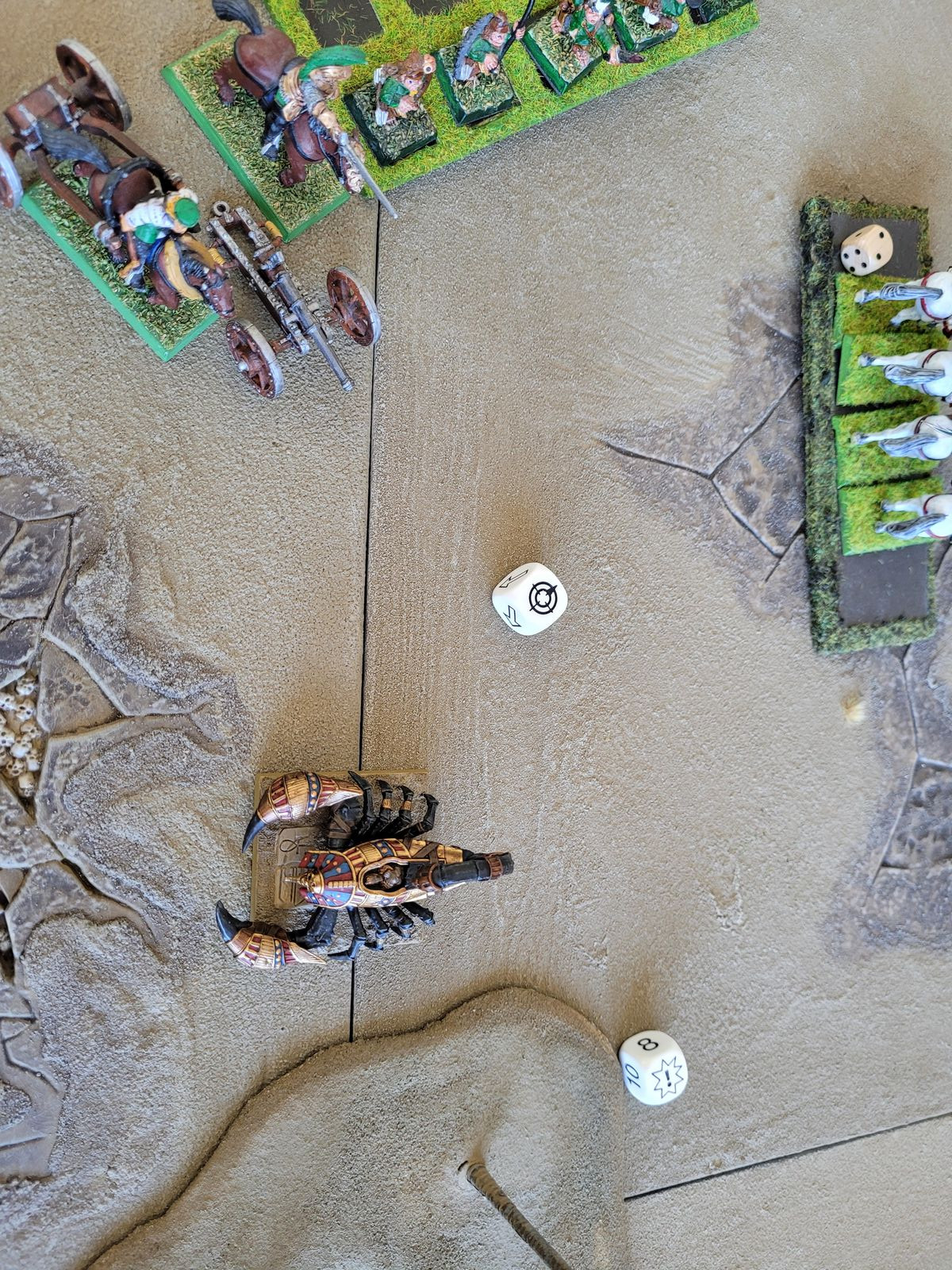 Auf der rechten Flanke wächst ebenfalls die Dynamik. Motiviert durch den Erfolg in der vorherigen Runde steigt Bronzino vom Pferd, visiert höchstpersönlich auf den Gruftkönig und schießt ihm den Streitwagen unter dem knochigen Allerwertesten weg. Etwas verwundert findet sich der Gruftkönig im Wüstensand wieder, wohingegen Bronzino mit einem „So geht das“ zufrieden aufs Pferd zurücksteigt.
