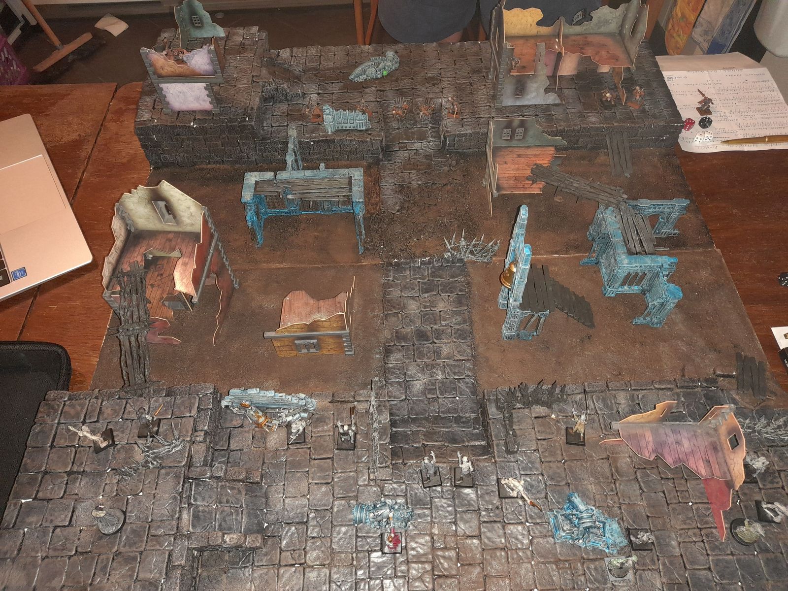 Für die Nekromanten war der Besuch des Geweihnachtsmarkets schmerzhaft (und das ohne diesen dampfenden Gewürzwein zu trinken!): Ritter - tot, 2 Schläger -tot, 1 Diebin - tot, Nekromantin.... leider unversehrt (scheint wohl doch was mitgenommen zu haben auf der Leichenschänder-Akademie). Trotzdem ein ziemlich hoher Body Count, selbst für Frostgrave Verhältnisse.