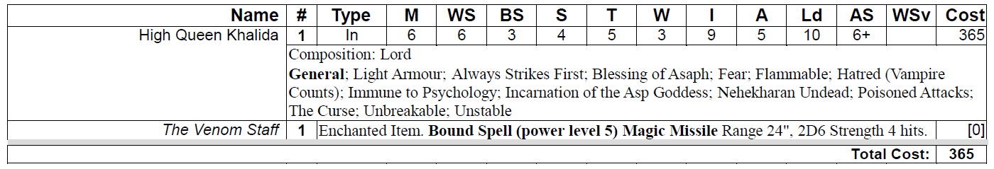 In diesem Szenario gehen die Punktkosten für Neferata und Khalida zu Lasten des Gesamt-Punkte-Budgets der jeweiligen Armee, jedoch nicht zu Lasten des Punkte-Budgets für Kommandanten.
