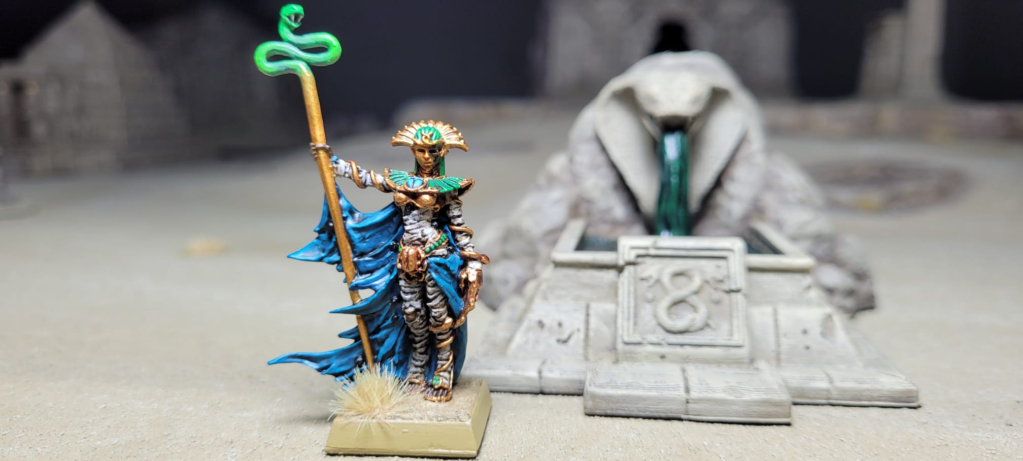 Die Hochkönigin tritt aus den Reihen ihrer Bogenschützen-Phalanx und hebt den Vipernstab zum Kampf.