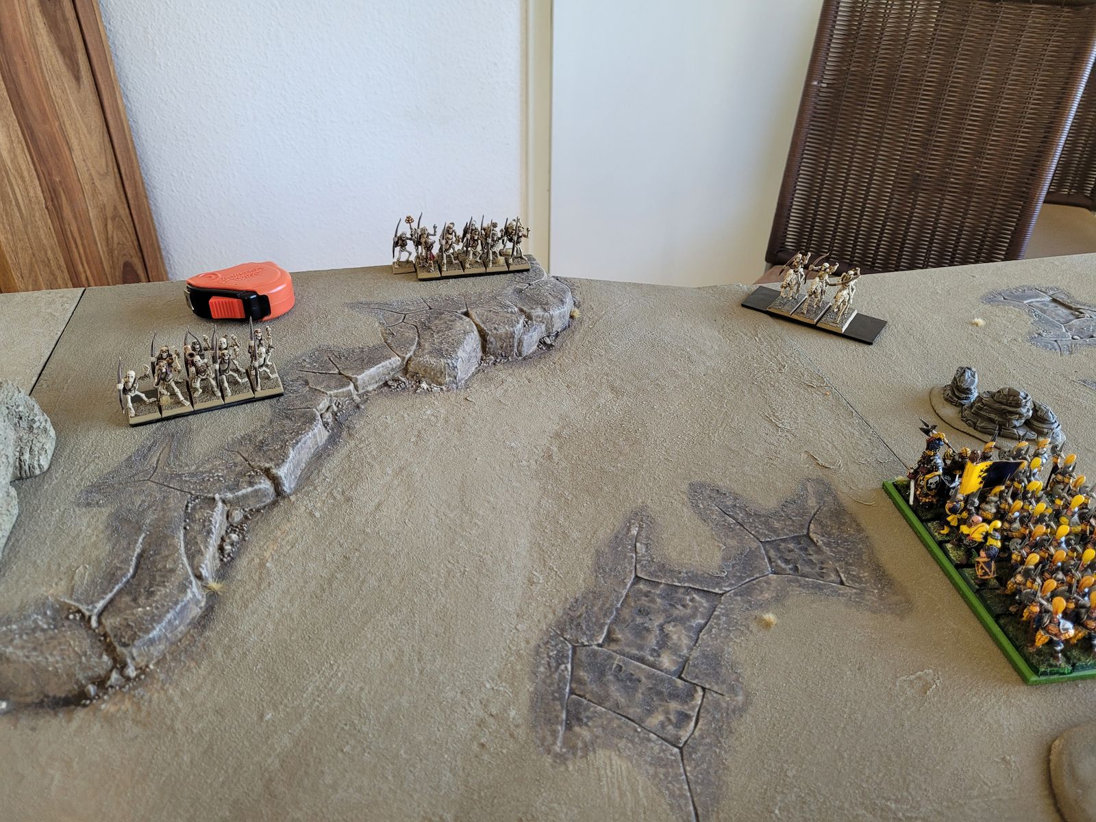 Die Gruftkönige bringen ein Katapult, eine Einheit Bogenschützen mit Todesmagier und eine weitere Einheit Geier. Der Todesmagier spricht Seelenraub auf Bronzinos Kavalleriekanone und tötet ein weiteres Besatzungsmitglied. Shems gleißender Strahl wird erfolgreich intoniert, aber ebenso erfolgreich gebannt. Die Bogenschützen töten durch Beschuss zwei Gardisten. Die Skelettreiter schießen auf Wüstenhunde, verwunden einmal, scheitern jedoch am Rüstungswurf. Die Geier greifen in den Rücken der Leoparden an, dringen aber nicht durch die Rüstungen durch. Verlieren übers Kampfergebnis zwei Lebenspunkte.