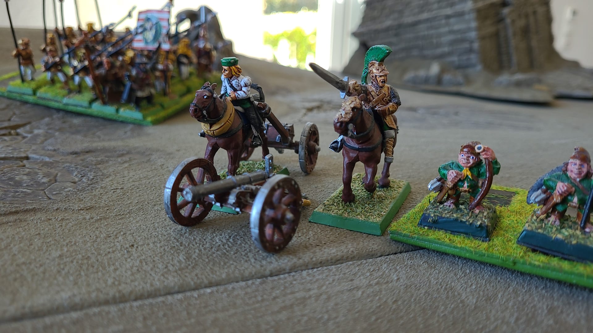 Aufstellung Söldner Die Söldner beginnen das Spiel von Spielfeldrand auf der den Tempeln entfernten Seite. Lumpins Kampfhähne als Kundschafter sichern den Brunnen. Bronzinos Kavalleriekanone nutzt die Vorhutbewegung um möglichst schnell zum Brunnen zu kommen
