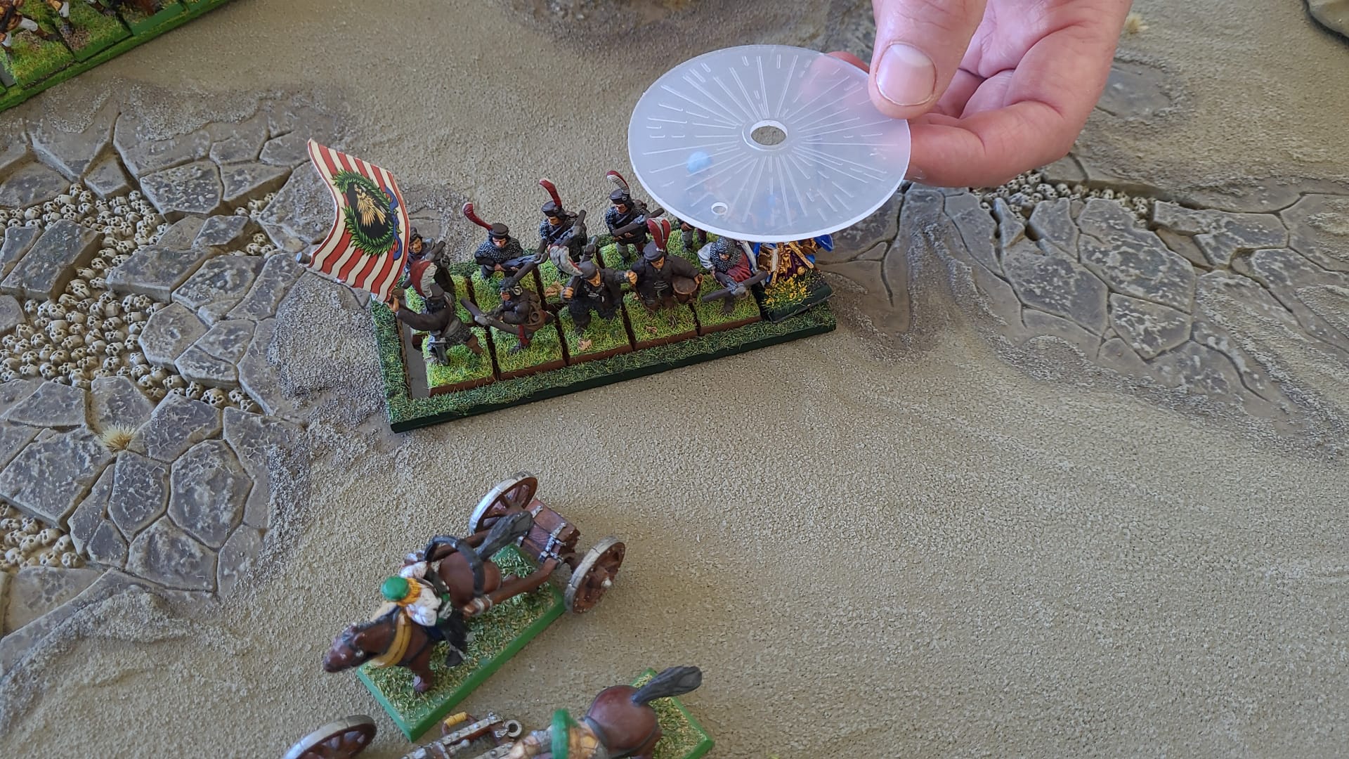 Auf der rechten Flanke wächst ebenfalls die Dynamik. Motiviert durch den Erfolg in der vorherigen Runde steigt Bronzino vom Pferd, visiert höchstpersönlich auf den Gruftkönig und schießt ihm den Streitwagen unter dem knochigen Allerwertesten weg. Etwas verwundert findet sich der Gruftkönig im Wüstensand wieder, wohingegen Bronzino mit einem „So geht das“ zufrieden aufs Pferd zurücksteigt.