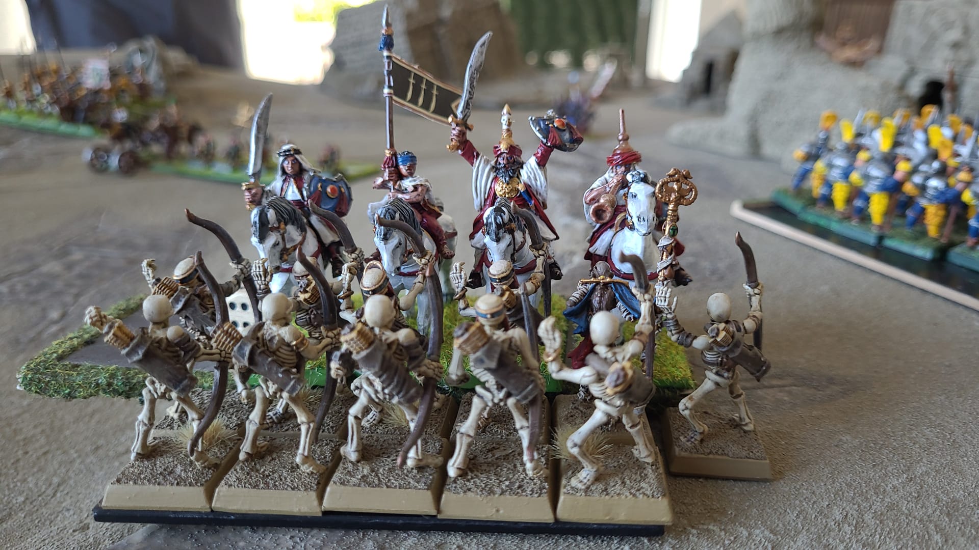 Die Gruftkönige bringen je eine Einheit Bogenschützenreiter und Skelettbogenschützen auf die Platte. Die Bogenreiter nehmen die Lumpins Halblinge ins Visier und von Pfeilen gespickt sinkt ein Halbling zu Boden.