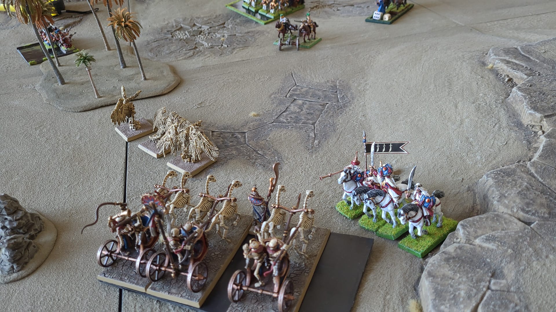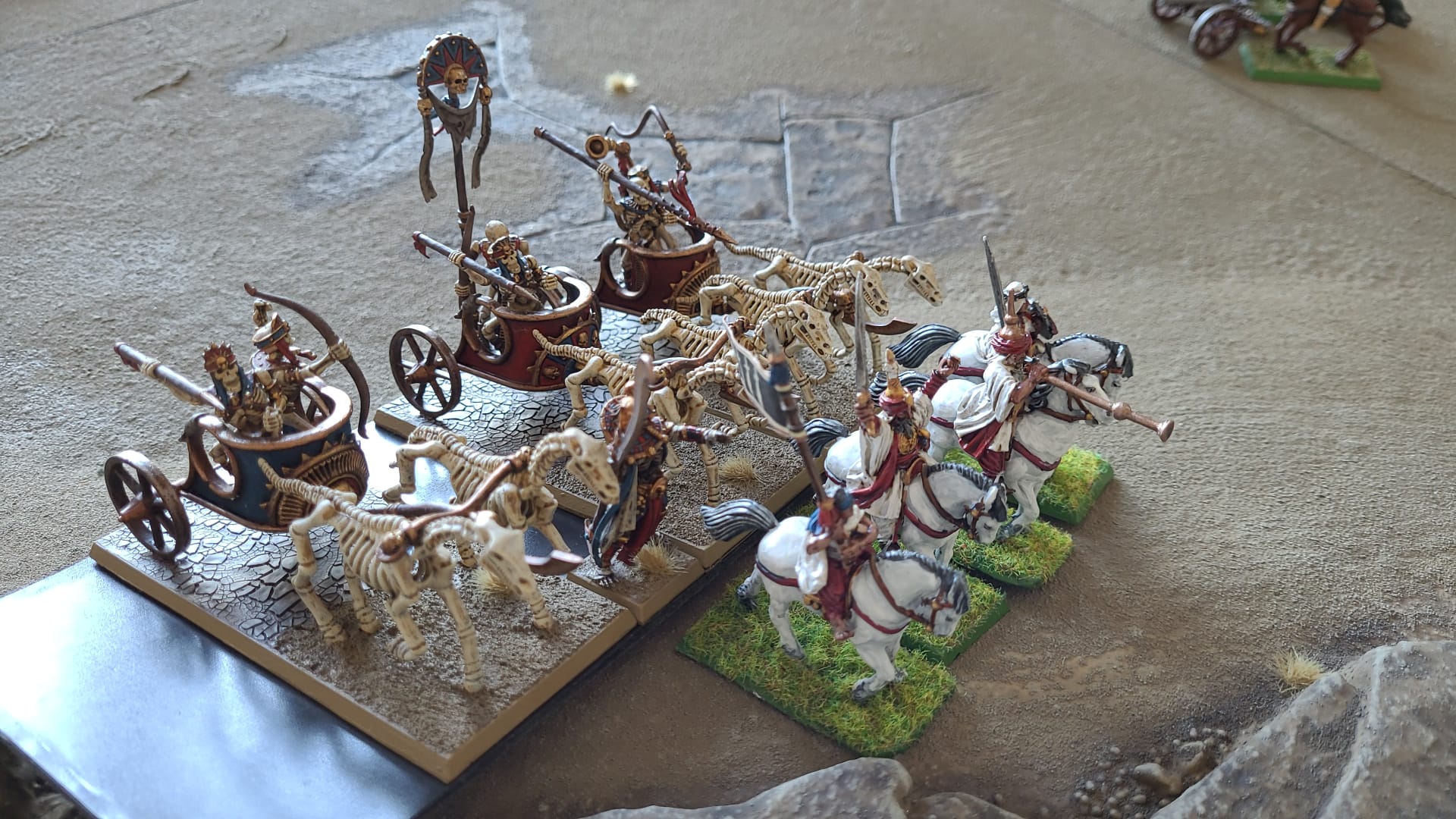 In der Runde der Gruftkönige greifen die Streitwagen die Wüstenhunde an. Wenig überraschend klemmen die Hunde die Schwänze ein und machen kehrt – Anstelle des Schlachtenrufs Al-MUKTARRR ist eher ein leises Ajajajajajaj zu hören…. Ihre Fluchtbewegung wird durch die Streitwagen vorzeitig beendet. Die Bogenschützen duellieren sich mit den Scharfschützen, sorgen aber nicht für signifikante Verluste.