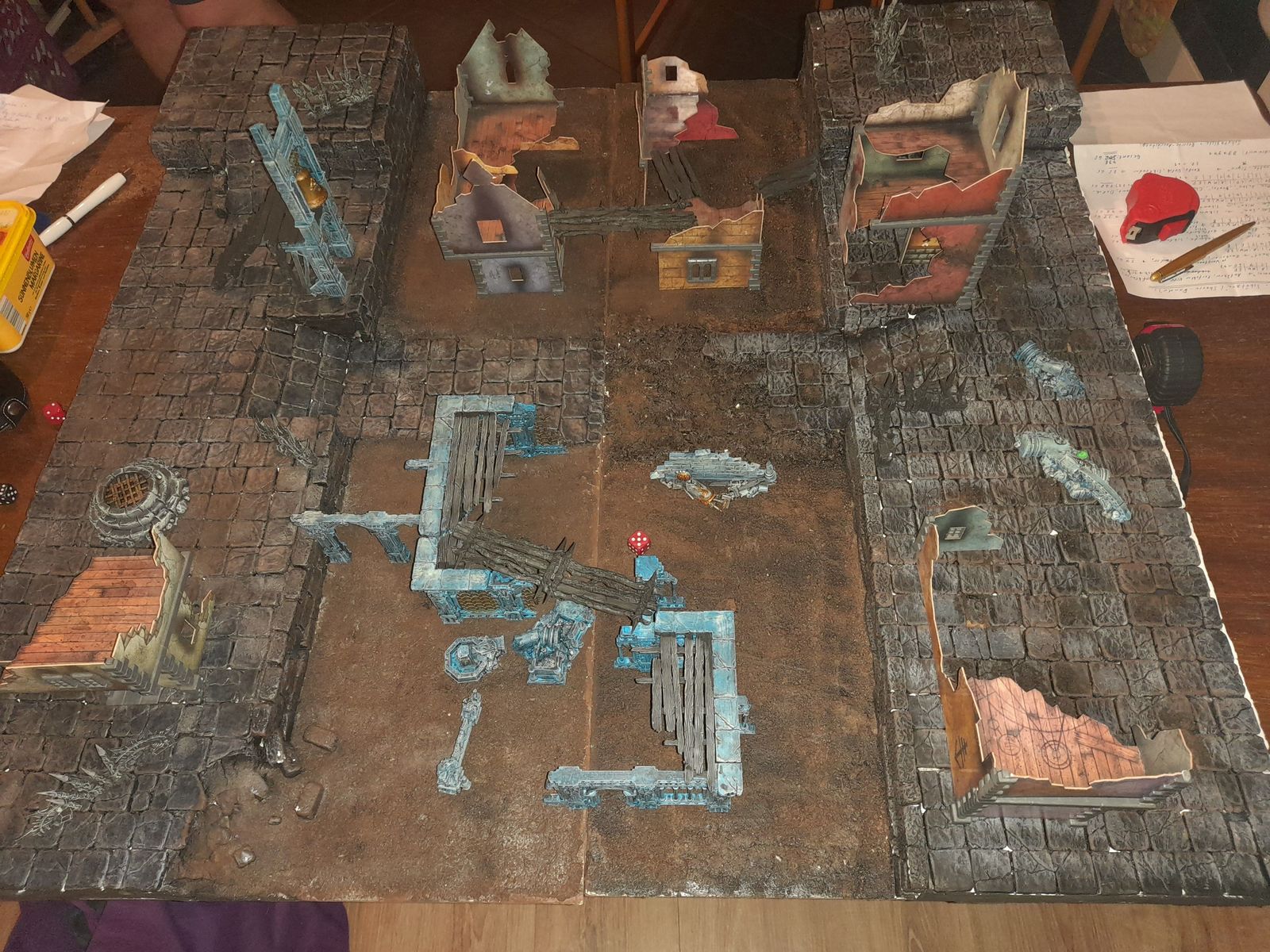 Für die Nekromanten war der Besuch des Geweihnachtsmarkets schmerzhaft (und das ohne diesen dampfenden Gewürzwein zu trinken!): Ritter - tot, 2 Schläger -tot, 1 Diebin - tot, Nekromantin.... leider unversehrt (scheint wohl doch was mitgenommen zu haben auf der Leichenschänder-Akademie). Trotzdem ein ziemlich hoher Body Count, selbst für Frostgrave Verhältnisse.