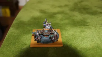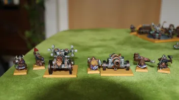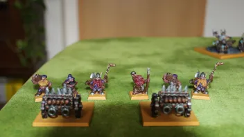 Gyrokopter (2 vorhanden) ebenfalls das uralte Modelle weil es so drollig aussieht und ich die Steampunkmäßigen Zwerge nicht mag. Ein Runenamboss (der bei uns eine seltene Auswahl ist der einfach W3 Verwundungen ohne Rüstungswürfe verursacht) und 2 Orgelkanonen sowie eine Flammsturmkanone und die klassische Kanone.