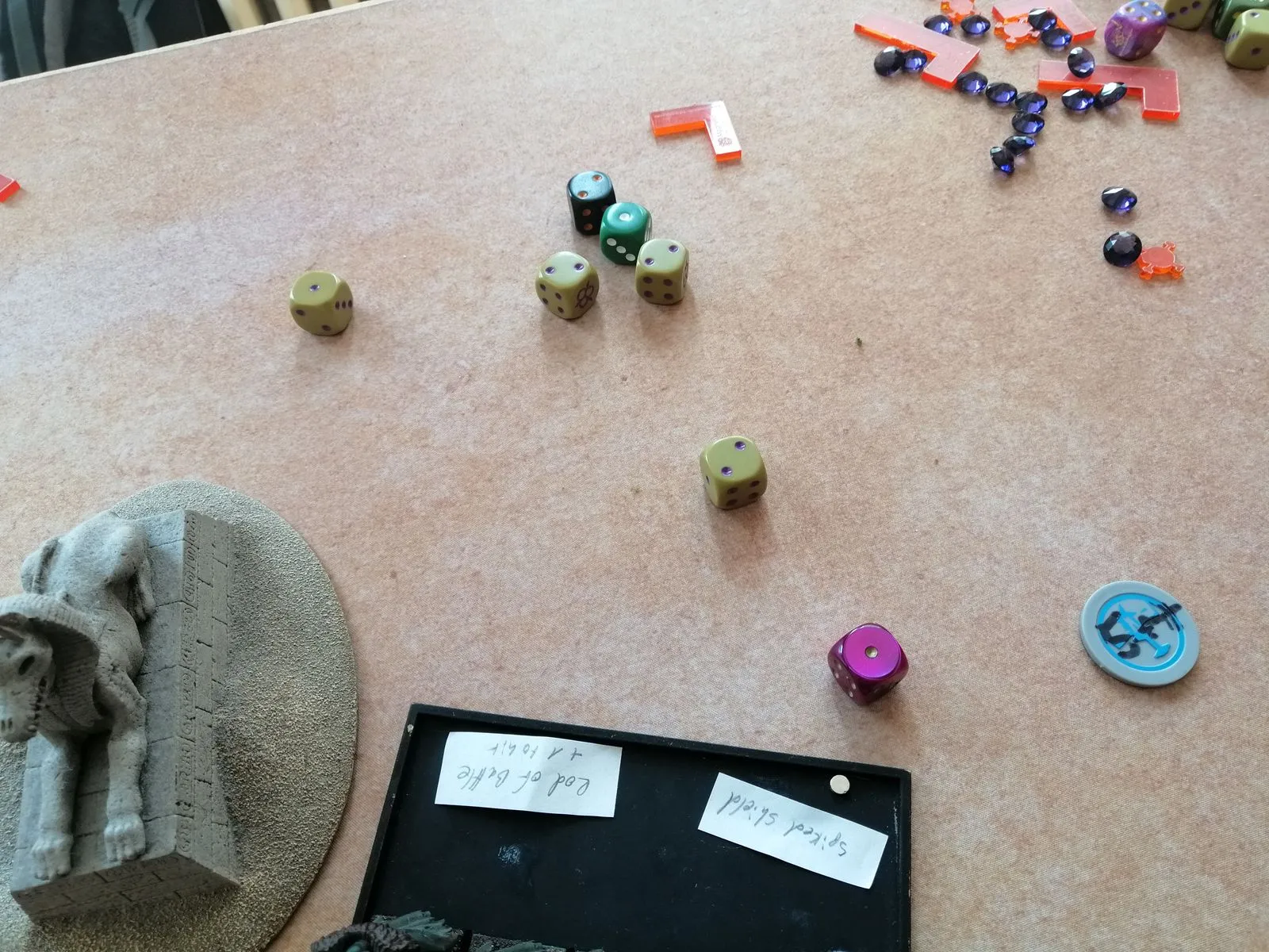 Ancestor Biggie versucht davonzukommen, kriegt aber zum Abschluss nochmal herzhaft vom Oger-Thaumaturgen (unten im Bild) die Hand of Heaven mit hoher Stärke in den Nacken - das ist zuviel für ihn. Nun jagt er kleine Babydrachen in den Ewigen Jagdgründen der Feldraks. Das war's dann auch, es stand sowieso kaum noch was auf dem Tisch.