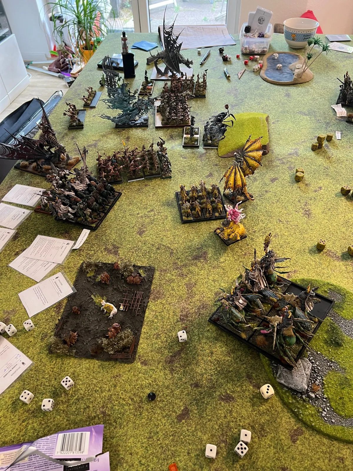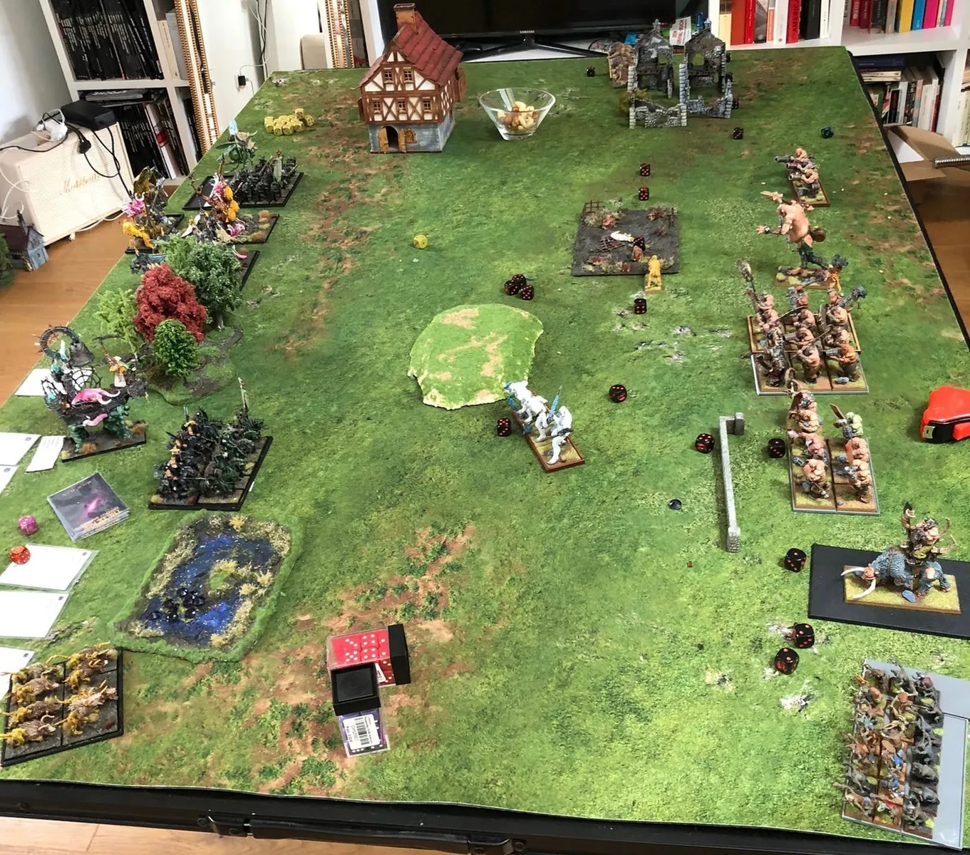 Mit zwei so nahkampflastigen Listen ein ziemliches Blutbad, ich glaube nach Runde drei waren beide Armeen schon mehr oder weniger über die Hälfte reduziert. Im Gegensatz zu den Ogern haben die Milzbrand Boys ihre Charactere nicht gerettet gekriegt und dazu kein Mittel gegen die zwei Fleischbusse gefunden. Das Ergebnis war ein 15:5, völlig verdient für die Oger nach der Kette von Fehlern bei Team Milzbrand.
