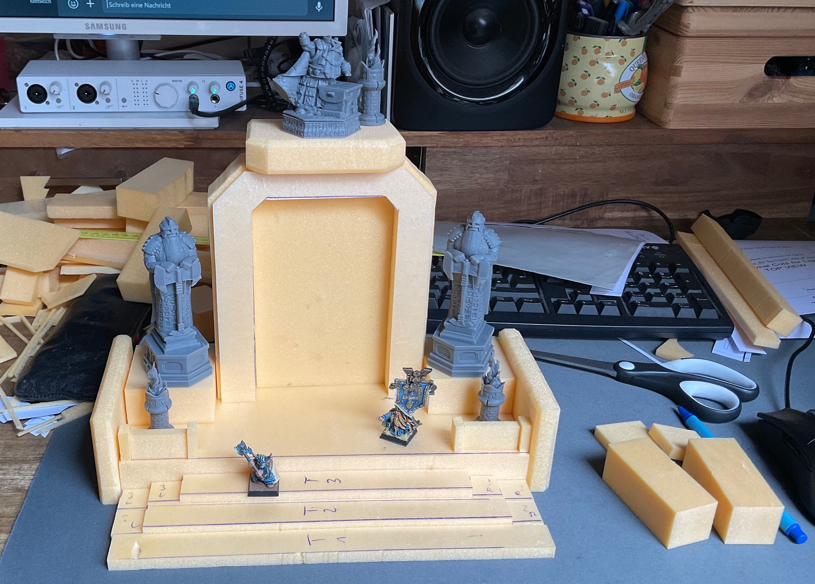 • Die Wächter sollten geradeaus blicken. Jeweils ein Feuerbecken vor jeden Wächter und dann jeweils am Fuß der Treppe auf jeder Seite eines, falls es dann keine Schwierigkeiten beim platzieren der Minis geben sollte. Wirklich eine tolle Arbeit, danke. Ich bin für diese Ideen der Marke Eigenbau immer sehr dankbar. Bin auch in diesem Zusammenhang ein großer Fan der TWS Videos.