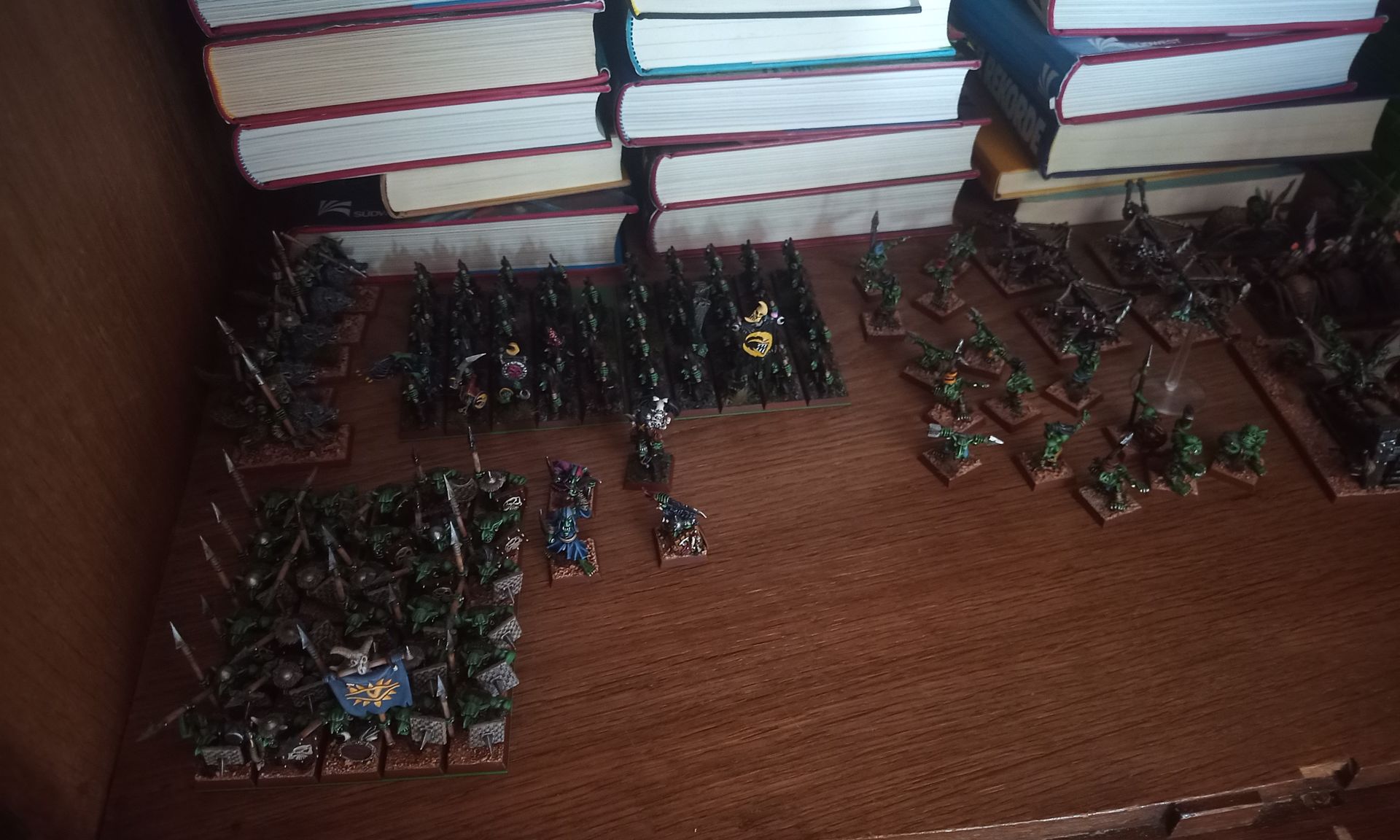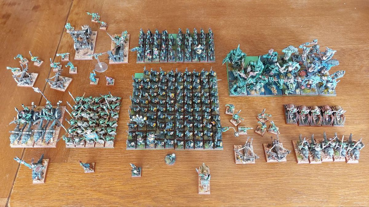 Speere bekommen in diesem Turnier +1 Stärke, wenn sie von Kavallerie oder anderen großen Einheiten angegriffen werden - daher habe ich ihnen den Vorzug über Handwaffe + Schild gegeben, die bei Goblins eigentlich sinniger sind.