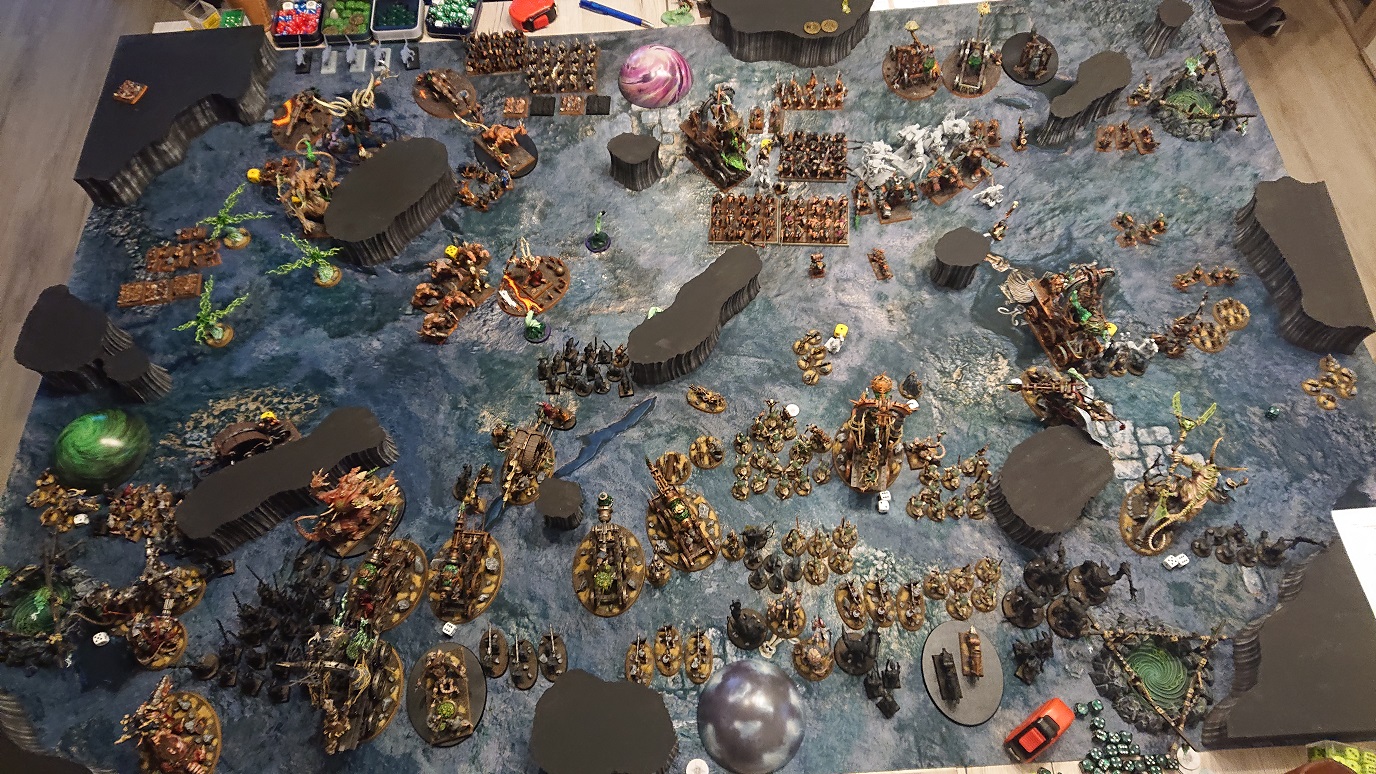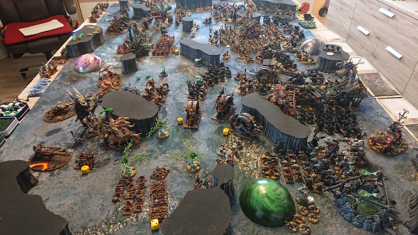 Und es begab sich, dass die Skaven der hiesigen großen Klans sich zusammenfanden, um eine große Schlacht in den Tunnelnetzwerken auszutragen. Auf beiden Seiten standen mehr als 13k Punkte, die nach und nach als Verstärkung aufs Feld kamen. Nicht, weil wir dafür besondere Szenarioregeln entworfen haben, sonder schlicht und ergreifen, weil nicht genug Platz auf dem Spielfeld war.