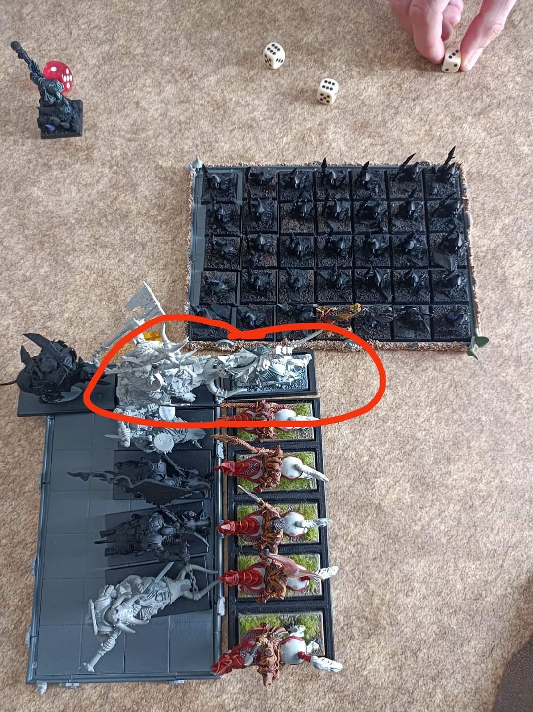 Im Bild läuft ein multipler Nahkampf zwischen Orkritter und Drachenprinzen. Die beiden rot eingekreisten Modelle befinden sich in einer Herausforderung, beide überleben und die Herausforderung bleibt im nächsten Nahkampf bestehen. Zwischenzeitlich haben die Nachtgoblins in den Nahkampf eingegriffen. Nun die Frage: