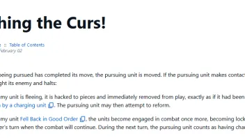 - Nach dem Überrennen oder wenn du eine fliehende Einheit mit Verfolgen einholst und vernichtest, darfst du erneut einen Moraltest durchführen um dich neuzuformieren, sogar dann, wenn du den ersten Zurückhalten-Test verpatzt hast oder rasend bist. Beachte bitte, dass du NICHT neuformieren darfst wenn du mit einer Verfolgen-Bewegung einen sich gesammelten Gegner einholst (nach FBIGO) oder überhaupt keinen Gegner triffst.