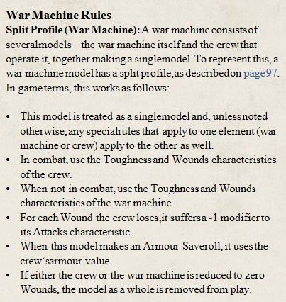 Steht da doch explizit. "When not in combat, use the Toughness and Wounds characteristics of the war machine."