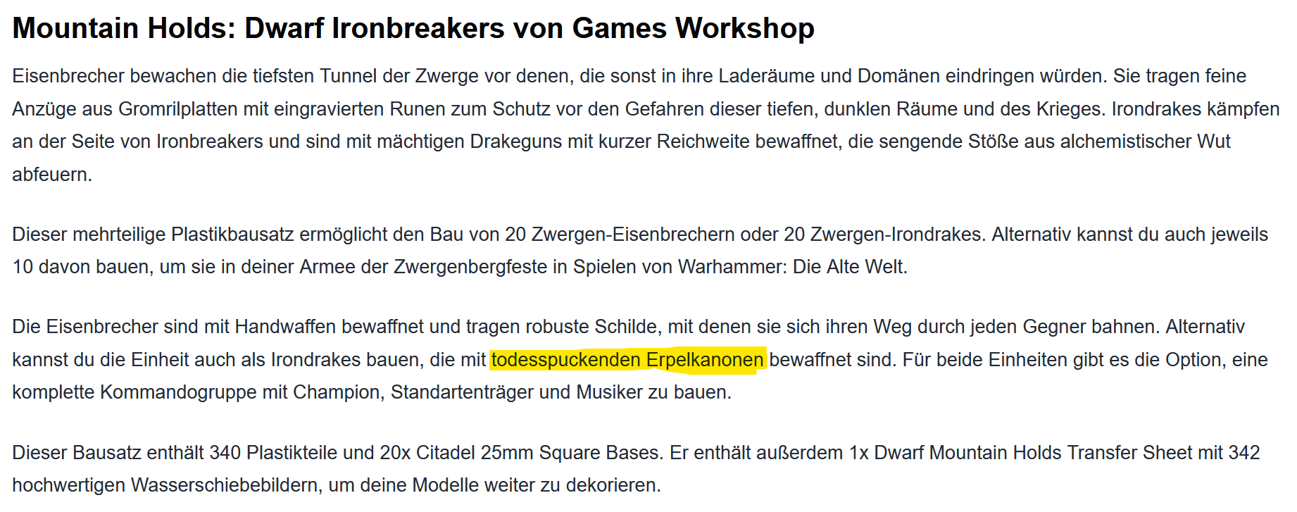 Die Expedition verbessert die Miner (haste nicht dabei) die Sapper in erster Linie durch die Gefährliche Terrain Regel. und Als nNahkampf hast du nur normale Klankriger oder Mercenaries (die das gleiche sind außer du nimmst sie mit speeren), die sind nicht wirklich brauchbar, die kannste immer gleich gegen Ranger austauschen. Was willst du mit dem Zwergenkarren tun? 65P is viel für die Sprengladungen. Wirkt ja nur auf die Einheiten welche dann unter M nah stehen, ansonsten kann das meiste bei einem Ja schon schießen und braucht diese nich und selbst da sind bei den Grenzläufern die Wurfäxte sinnvoller für kurze Reichweite.Die BF3 der Thunderer tun einfach zu weh. da helfne auch die move and shoot negierenden Mali de upgrades nicht. auf die 4 treffen im idealfall ist eben zu shclecht, darum sind in den meisten zwergenliste entweder Grenzläufer oder Drakefires. Weil alles andere auf Grund der niedrigen BF zu unbrauchbar ist. Ist sehr Schade denn eine mobile ASchützenarmee klingt schon cool, kommt so aber nicht wirklich zustande mit gutem Effekt. Die Holds müssen nur auf wenig verzichten bekommen aber soviel mehr besseres als alternative dass die Expedition sich nicht wirklich lohnt.