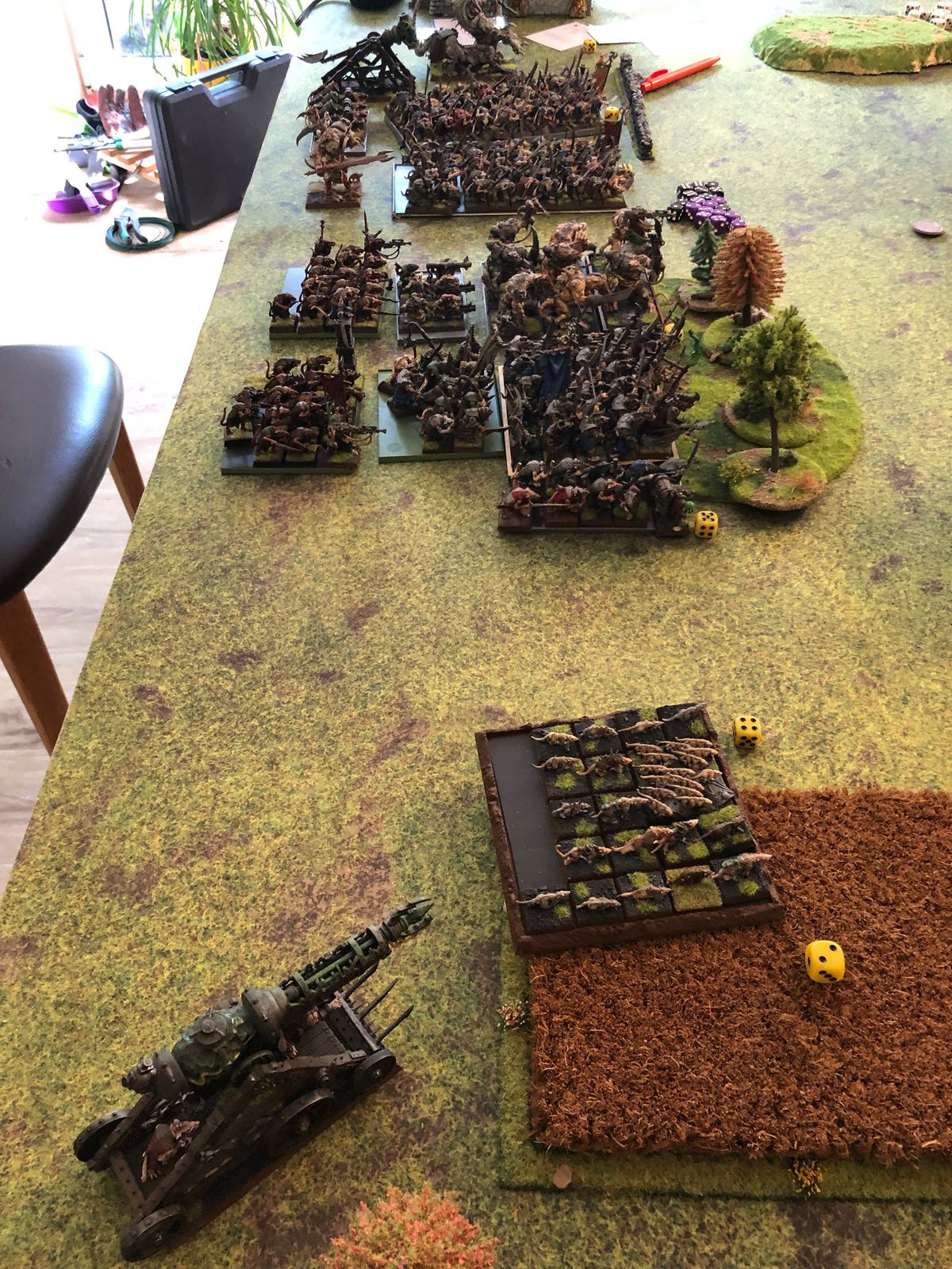 Ich habe zwei Probleme mit den Skaven, beide sind persönliche Meinungen und keine Tatsachen. Einmal ist es die einzige meiner Armeen die beim Wechsel WH zu 9th etwas verloren hat, sowohl vom Hintergrund als auch auf dem Schlachtfeld. Bin mit der Fixierung auf das Römische nicht warm geworden und die Armee ist jetzt zu brav. Der zweite Grund ist ganz einfach, dass es die einzige Armee ist, die ich (größtenteils) nicht selbst bemalt habe und ich glaube dass man selbstbemalte Truppen einfach immer lieber hat. Trotzdem dürfen die Skaven ab und an mal raus und Samstag war so ein Tag.