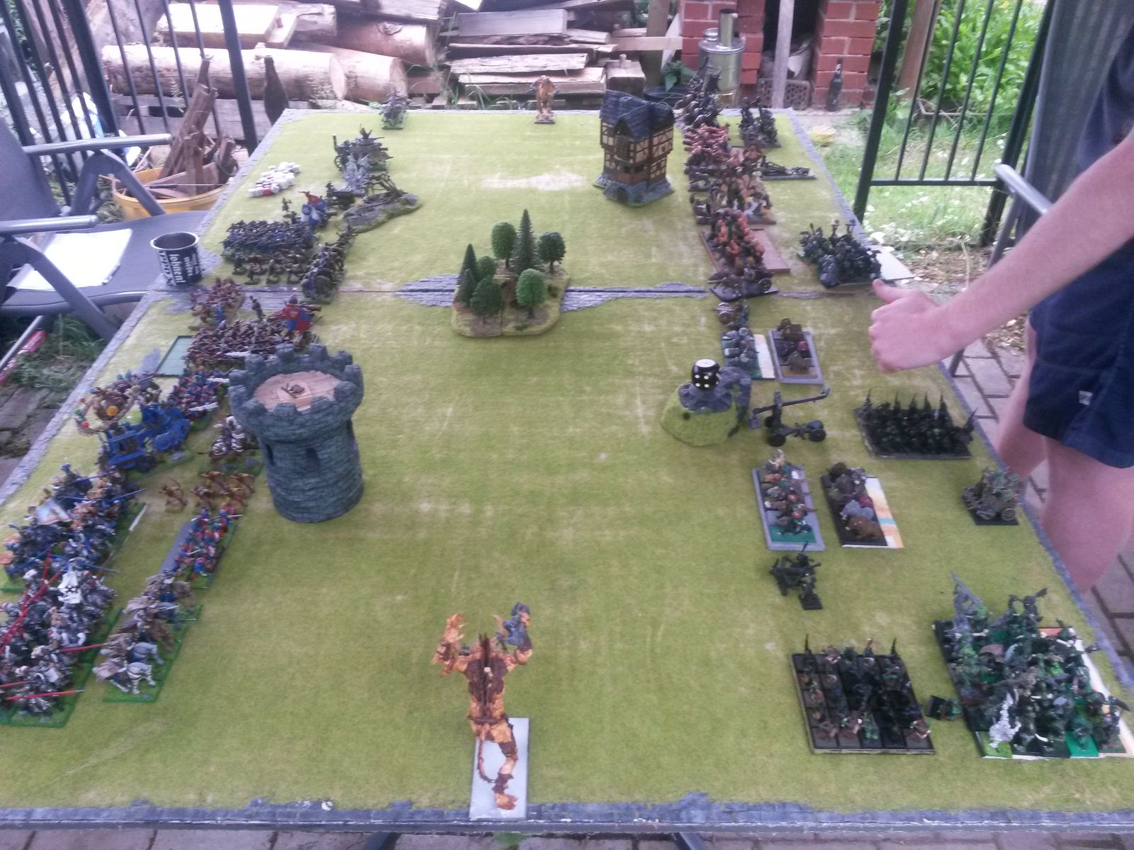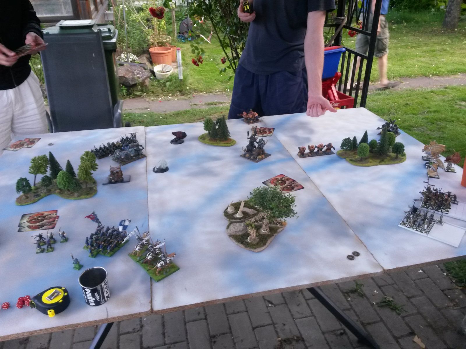 Ich bin bereits gestern in Marburg eingetroffen (leider stark verspätet, weil umgestürzte Bäume die Schienen blockiert haben) und habe gegen den Gastgeber ( Graf Chlodwig III ) mein erstes Spiel (seit Halle im April) Warhammer Fantasy (achte Edition) spielen dürfen (wir setzten auch gleich unsere Listen für´s Turnier morgen ein)...Es war ein ständig wankendes Spiel, bei dem keine Seite dauerhaft die Führung halten konnte und das meine Jungs auch nur knapp für sich entscheiden konnten!