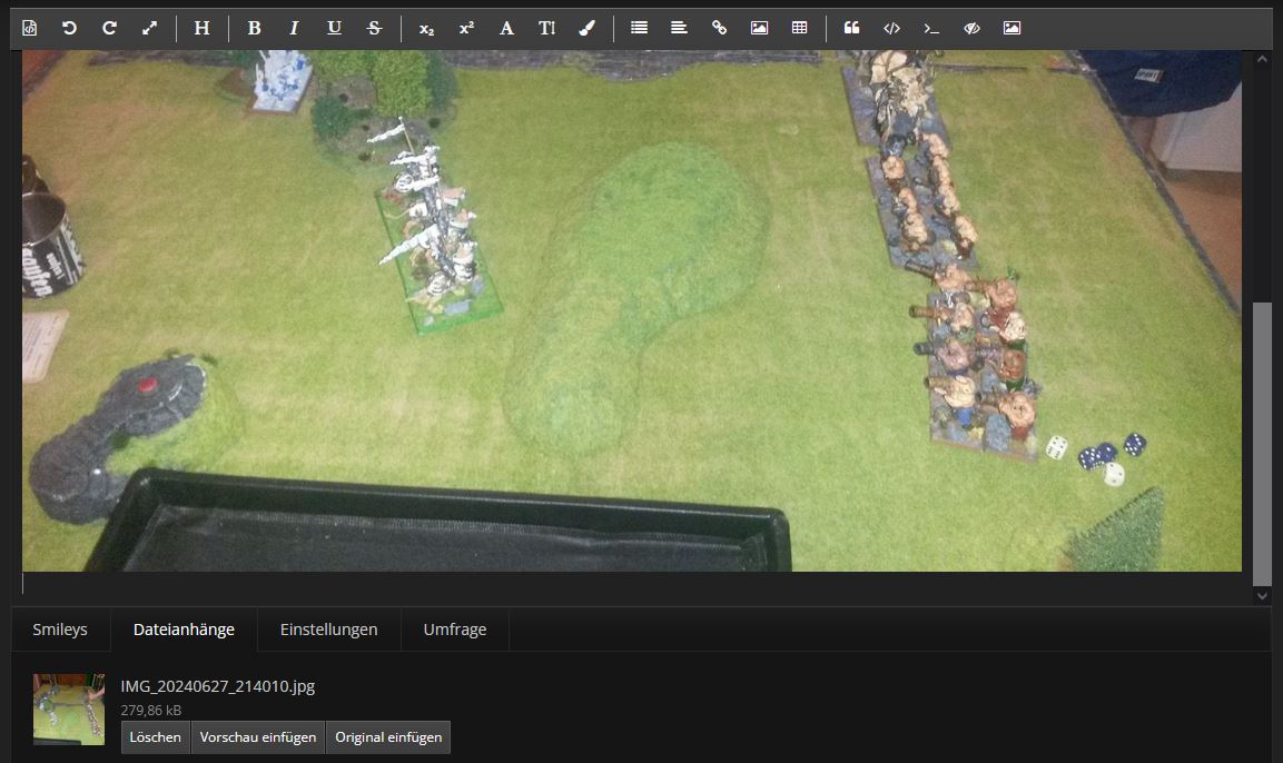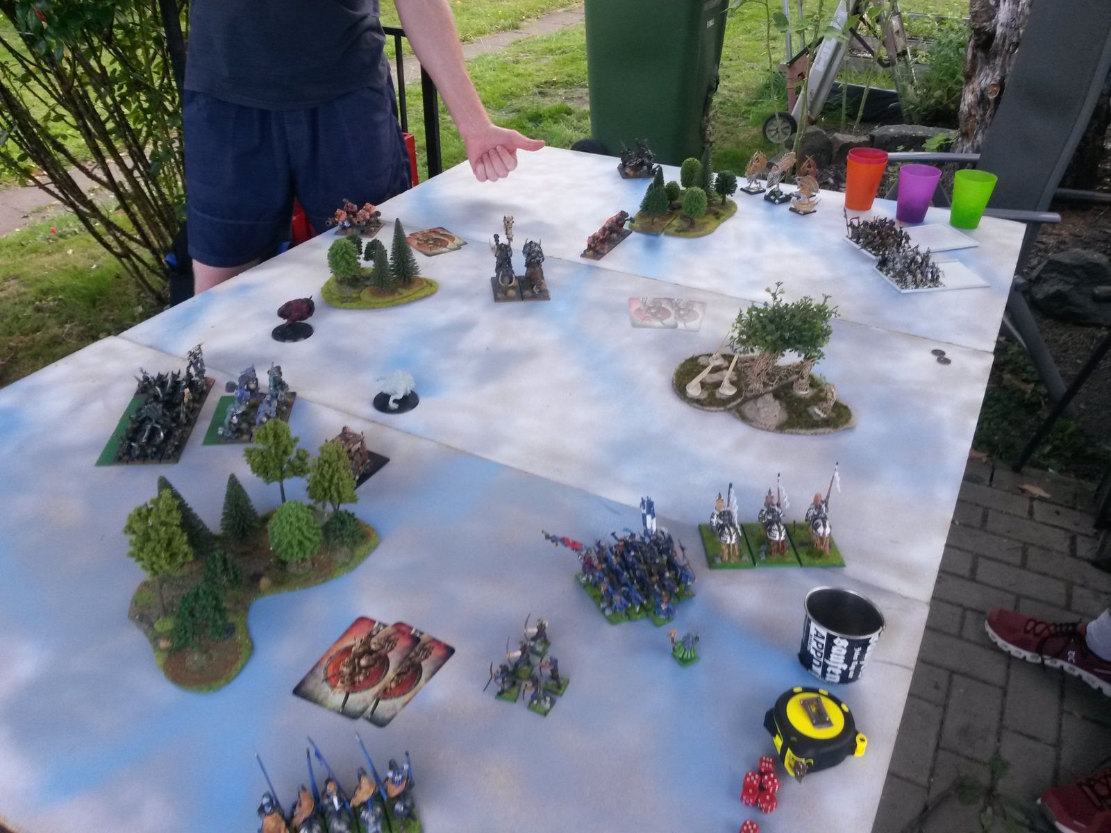 Ich bin bereits gestern in Marburg eingetroffen (leider stark verspätet, weil umgestürzte Bäume die Schienen blockiert haben) und habe gegen den Gastgeber ( Graf Chlodwig III ) mein erstes Spiel (seit Halle im April) Warhammer Fantasy (achte Edition) spielen dürfen (wir setzten auch gleich unsere Listen für´s Turnier morgen ein)...Es war ein ständig wankendes Spiel, bei dem keine Seite dauerhaft die Führung halten konnte und das meine Jungs auch nur knapp für sich entscheiden konnten!