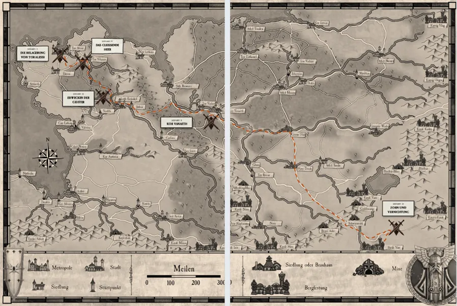 Die Kampagne hat nun eine Übersichtskarte, auf der alle fünf Szenarios abgebildet sind. Es handelt sich natürlich um die bekannten Umrisse der Alten Welt, doch schaut genau hin. Städte wie Altdorf oder Couronne existierten damals noch nicht und, so sich einst die stinkenden Siedlungen der Menschen erheben werden , stehen noch immer die gleißenden Türme der Elfen und die prachtvollen Städte der Zwerge.
