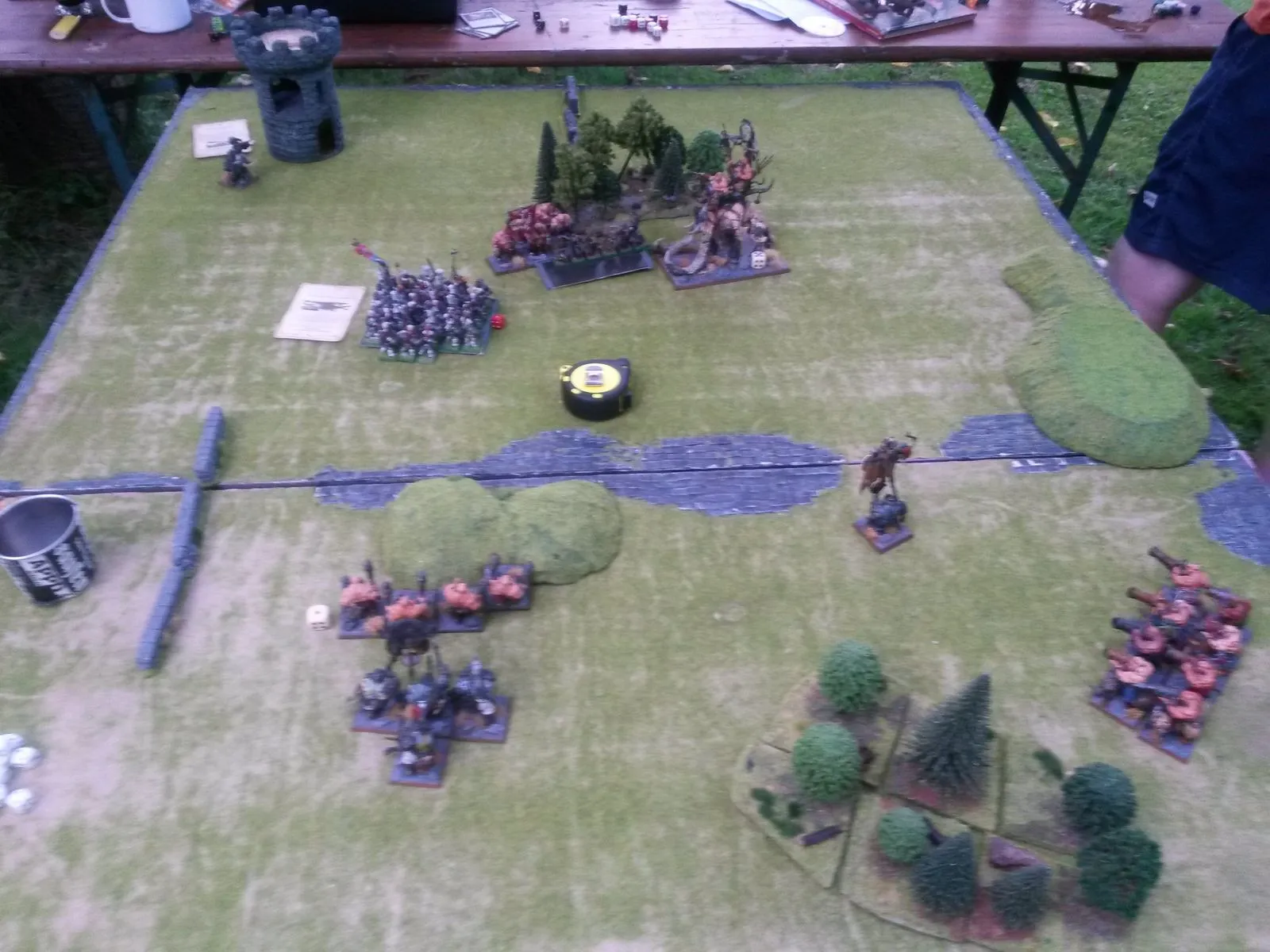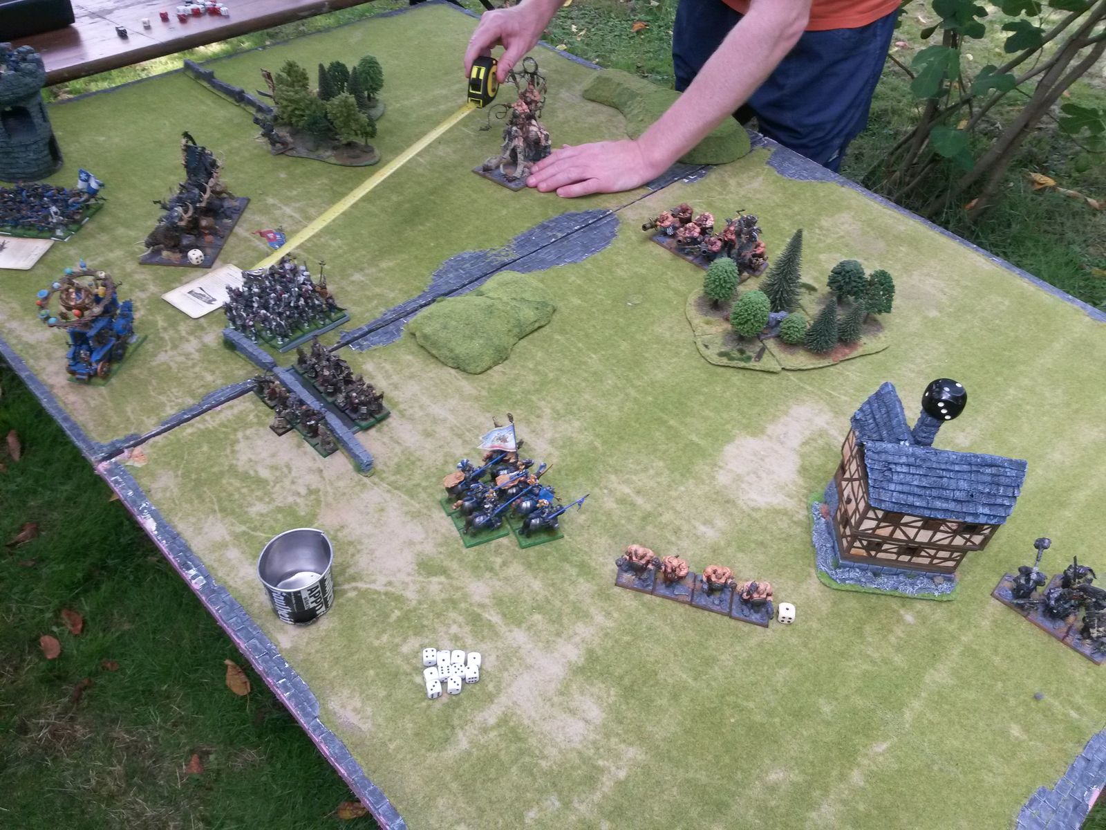 Meine Kavallerie war da wohl etwas ungestüm unterwegs, während die vier gewieften Oger an dem Ritter-Block vorbeieilten, um nicht von ihm angegriffen zu werden...Danach wurde geballert, weshalb ich gerade am Ausmessen der Distanz vom Donnerhorn zum Gegner war, um da vermutlich die Schablone der "Eisspuckattacke" drauf zu platzieren!
