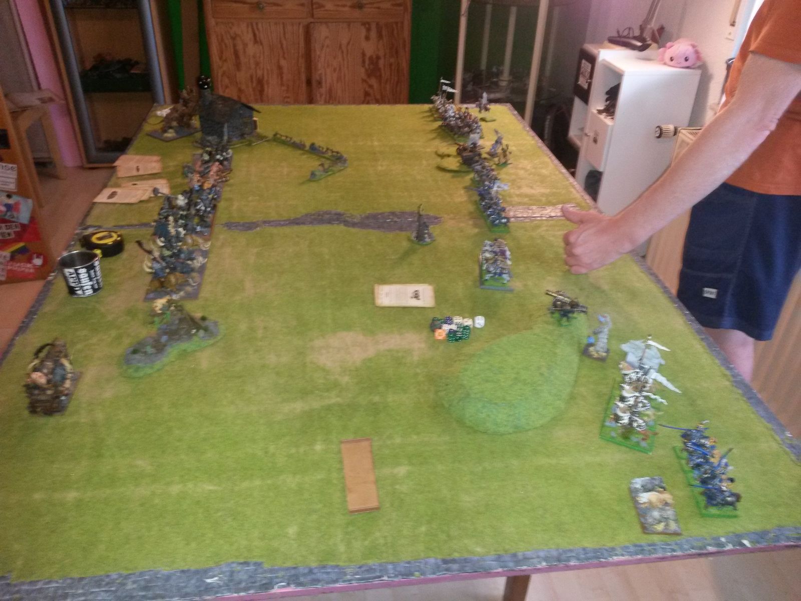 Meine Kavallerie war da wohl etwas ungestüm unterwegs, während die vier gewieften Oger an dem Ritter-Block vorbeieilten, um nicht von ihm angegriffen zu werden...Danach wurde geballert, weshalb ich gerade am Ausmessen der Distanz vom Donnerhorn zum Gegner war, um da vermutlich die Schablone der "Eisspuckattacke" drauf zu platzieren!