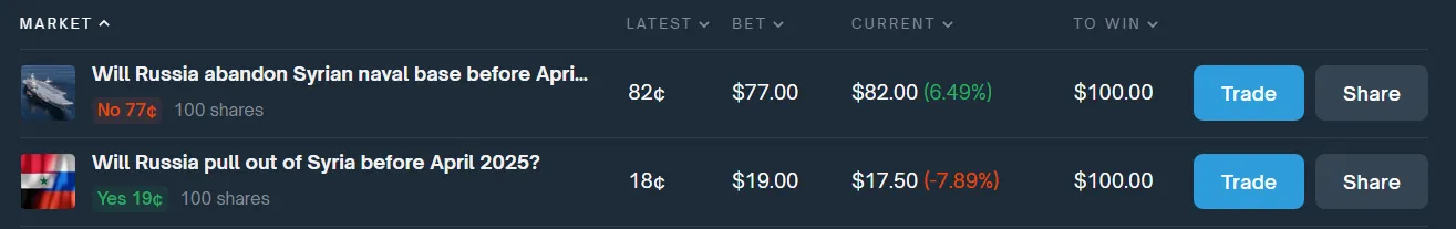 Da 77+19 bloß 96 ergibt, konnte man sich hier im Grunde 100 $ für den Preis von 96 $ kaufen. Ausnahme: In diesem Fall wäre es dumm gewesen, wenn Russland seine Marinebasis aufgegeben hätte, aber noch andere Truppen in Syrien bis April stationiert gelassen hätte. Aber das habe ich wie gesagt für sehr unwahrscheinlich gehalten.