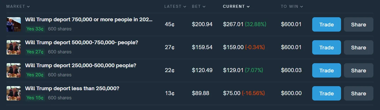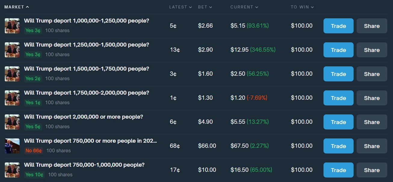 In diesem etwas aufwändigen Fall ging es um die Frage, wie viele Personen Trump im Jahr 2025 abschieben würde. Dafür war aber diesmal die Übereinstimmung und damit die Absicherung perfekt. Die Wetten, welche eingegangen wurden, decken jedes mögliche Szenario von 0 bis ∞ ab. Insgesamt wurden wieder 100 Anteile von jeder Wette gekauft, aber insgesamt nur 2,66+2,9+1,6+1,3+4,9+66+10 = 89.36 $ eingesetzt mit einem potenziellen Gewinn von 100 $.