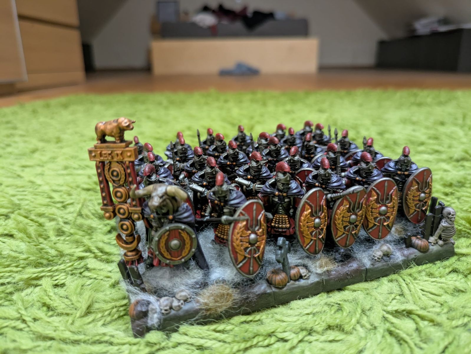 Beim Spiel der untoten Römer gegen die Oger war ich leider nicht dabei da ich für alle gegrillt habe. Und da das Spiel sehr kurz war habe ich auch nicht später noch einsteigen können. Aber es war wohl etwas zu hoch gepokert von unserem Untoten Cesar. Hier ein Paar Bilder Der Armee das man es sich besser vorstellen kann.