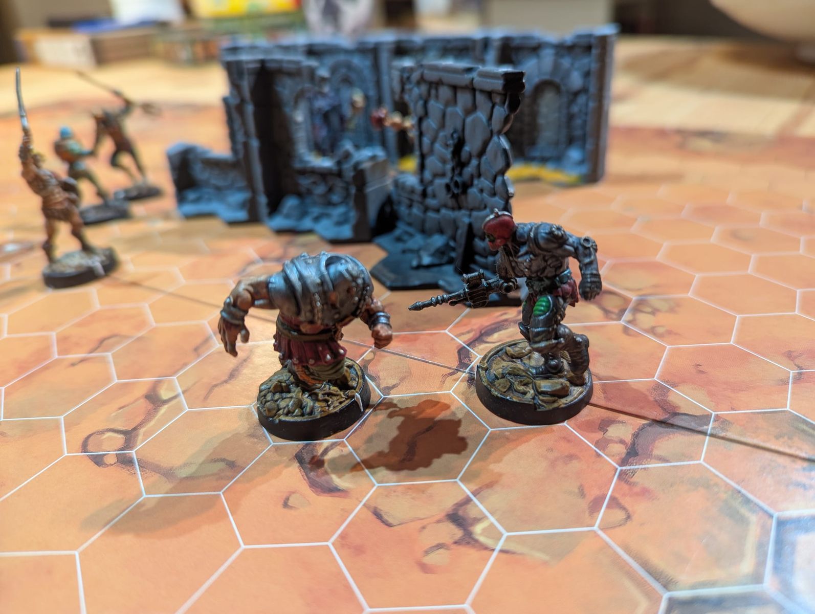 Dann kahm Masters of The Univers Battleground, hier handelt es sich eigentlich um ein Brettspiel bei dem man den alten Kampf Gut gegen Böse nachspielt. Jeder bringt drei Helden/Schurken ins Spiel, die dann mit ihren Fähigkeiten und Ausrüstungen versuchen Bestimmte Punkte einzunehmen oder den Gegner zu Töten. Ich fand unser Spiel nicht ganz so spannend, weil wir das Start Szenario gespielt haben da gab es feste Charaktere und nur ausgewählte Ausrüstung. Mann konnte klar erkennen das hier die Spannenden Gegenstände weggelassen worden sind damit man leichter die Regeln Lernt. Für Fans ist es dennoch ein cooles Spiel aber es lebt dann doch schon davon das man sich selber sein Team mit passender Ausrüstung zusammenstellt. Leider hatten wir keine Zeit mehr für einen zweiten versuch aber wir wollen es beim nächsten treffen nochmal versuchen. Anbei einpaar nachgestellte Szenen