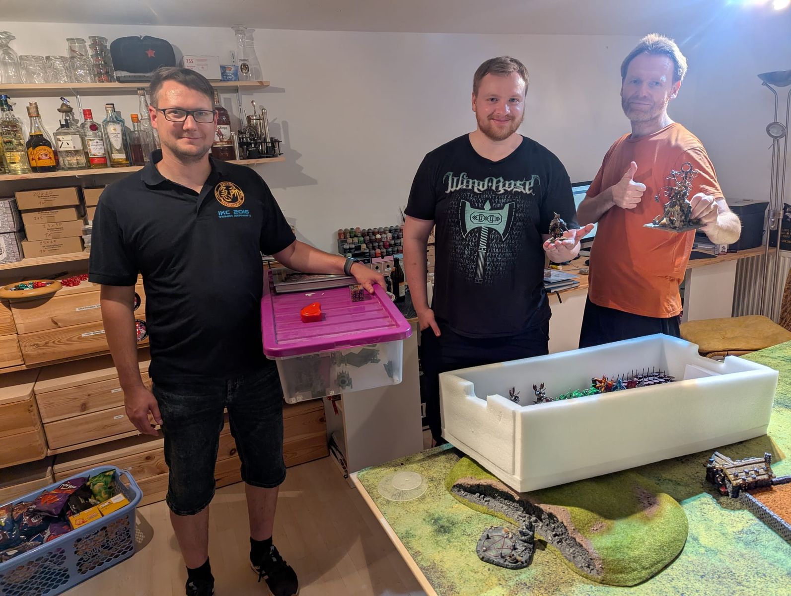 Und das wird auch noch passieren, ist nur mal wieder eine Frage der Zeit...Hier aber noch das letzte Bild aus Deinem genialen Hobby-Keller, das Du mir dankenswerter Weise separat zugeschickt hast und mich zusammen (Erlaubnis zum Zeigen wurde von beiden eingeholt) mit dem Cathay-Spieler und dem Anführer der untoten Römer zeigt: