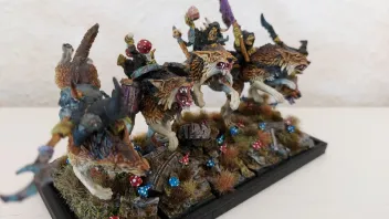 Vom Maßstab her passt das tatsächlich ganz wunderbar mit den Squigreitern und die klassischen Wolfsreiter hätten sich optisch nicht so in das Nachtgoblin-Thema eingefügt (wobei ich die klassischen Modelle ja generell sehr schön finde).