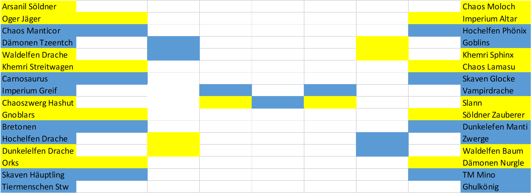 Da beim Turnier noch Chaoszwerge und nach 6.Edi Regeln auch Söldner und Gnoblars dabei sind und das Turnier ein KO System hat wurde auf 32 Armeelisten aufgestockt. Dadurch sind manche Völker auch doppelt vertreten.
