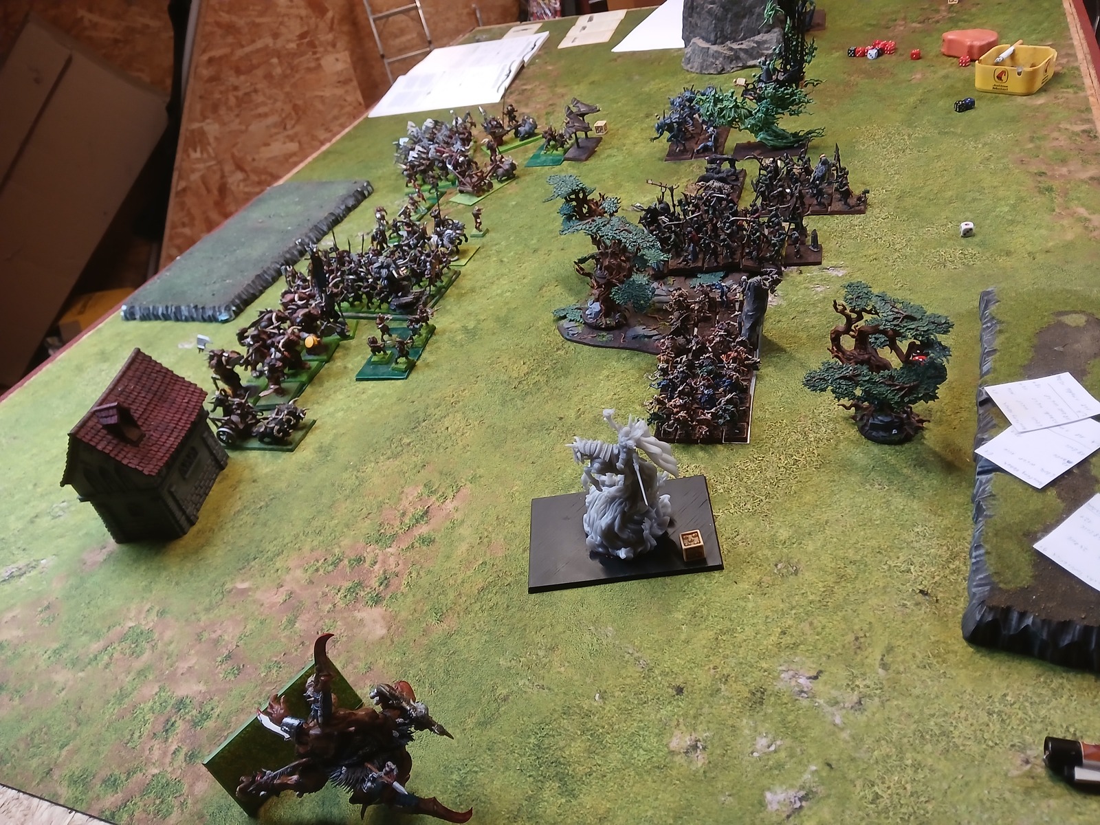 Bei den Tiermenschen geht alles eher verhalten vor, außer dem Ghorgor. Der übertreibt es sogar etwas und kommt genau in Schreireichweite des Ghulkönigs der maximal in seine Richtung fliegt. So kommt es wie es kommen musste und der Ghorghor wird in der ersten Runde erschrien. Die Vampirfledermäuse greifen die Plünderer an die sich aber gegenseitig nicht viel machen.
