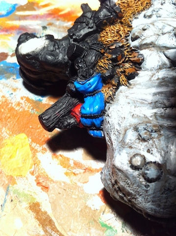 Auch deshalb spielt die ausufernde Basegestaltung eigentlich keine Rolle, auch die blauen Augen haben keinen fluffigen Hintergrund, obwohl mir dazu sicher noch was einfallen würde. Sieh den Oger einfach als Vitrinenmodell *hust*, nur halt auf meinem Malniveau.
